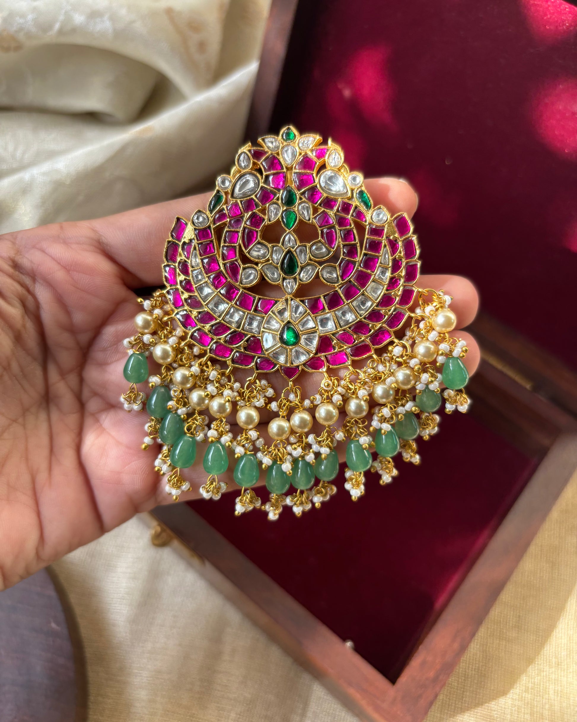 With its soft gold-plated finish and elegant structure, this pendant can be styled as a statement necklace or repurposed as a stunning hair accessory for bridal or festive looks.