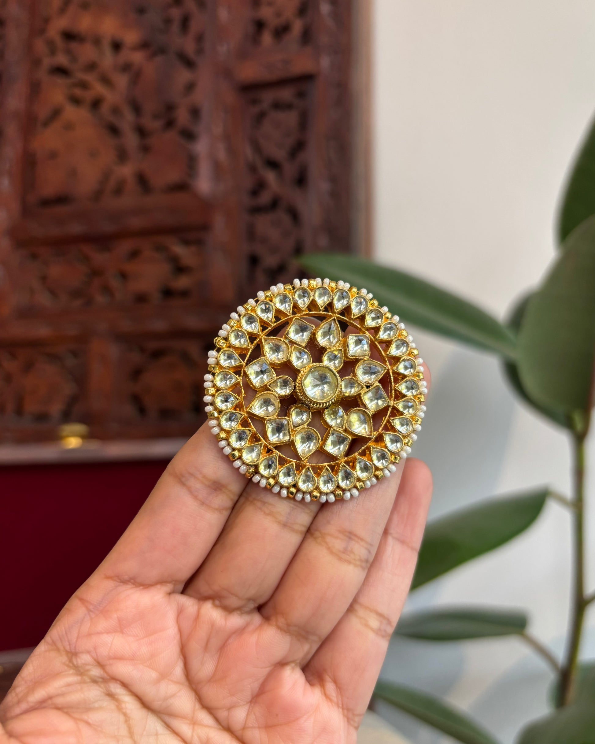 With its soft gold-plated finish and elegant structure, this pendant can be styled as a statement necklace or repurposed as a stunning hair accessory for bridal or festive looks.