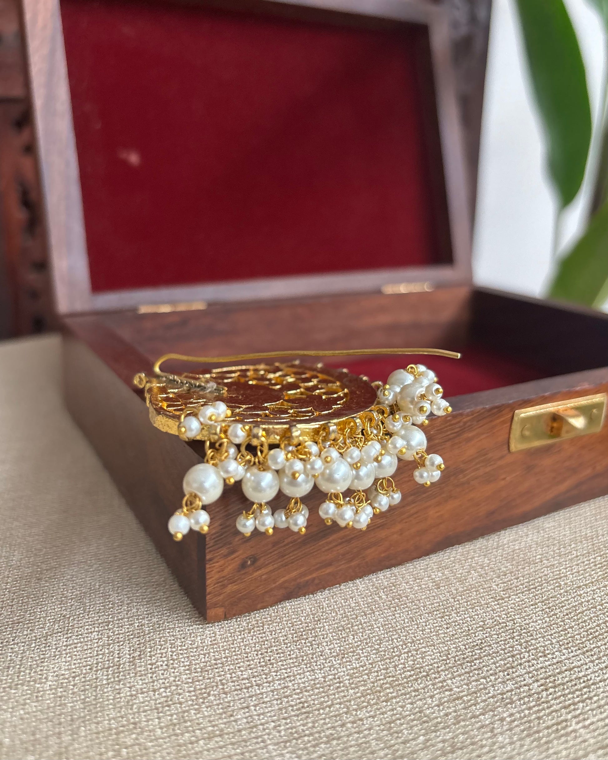 With its soft gold-plated finish and elegant structure, this pendant can be styled as a statement necklace or repurposed as a stunning hair accessory for bridal or festive looks.