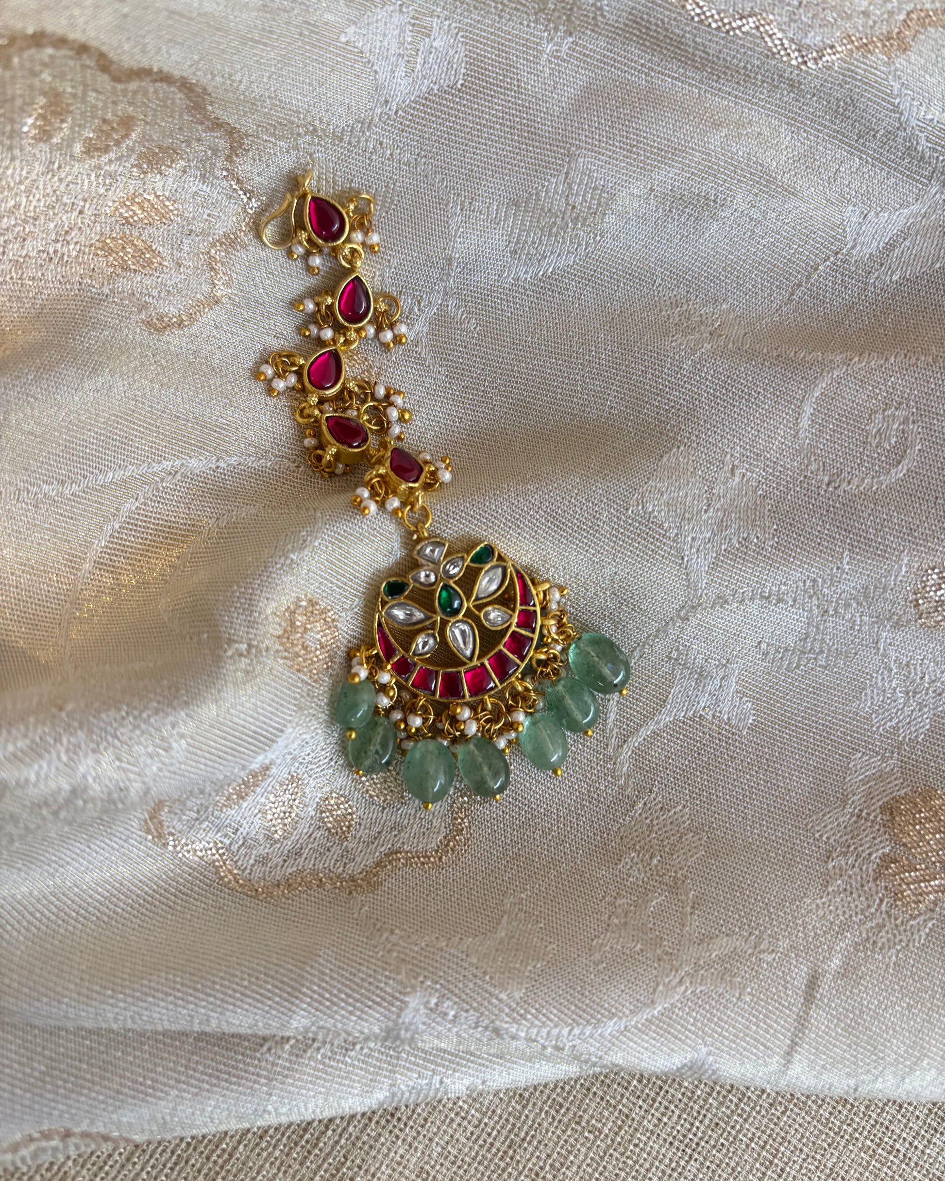 This elegant Jadau Kundan Maang Tikka features a beautifully handcrafted floral pendant, adorned with traditional white kundan stones and delicate detailing. What makes it truly special is the green pop in the tikka, adding a graceful and symbolic touch to the design.
