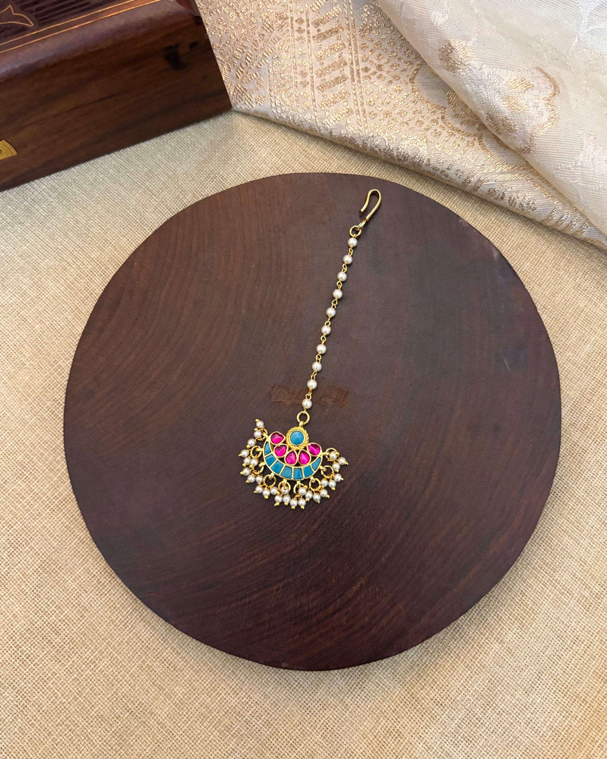The beautifully crafted pendant features intricate Kundan work with rich blue and pink enamel accents, adding a touch of heritage charm. The lower edge is adorned with delicate pearl clusters, enhancing its luxurious appeal. A single-strand pearl chain gracefully connects the pendant to the hook, ensuring a secure and elegant fit on the forehead. Perfect for weddings and festive occasions, this maang tikka is designed to elevate your ethnic look with royal sophistication.