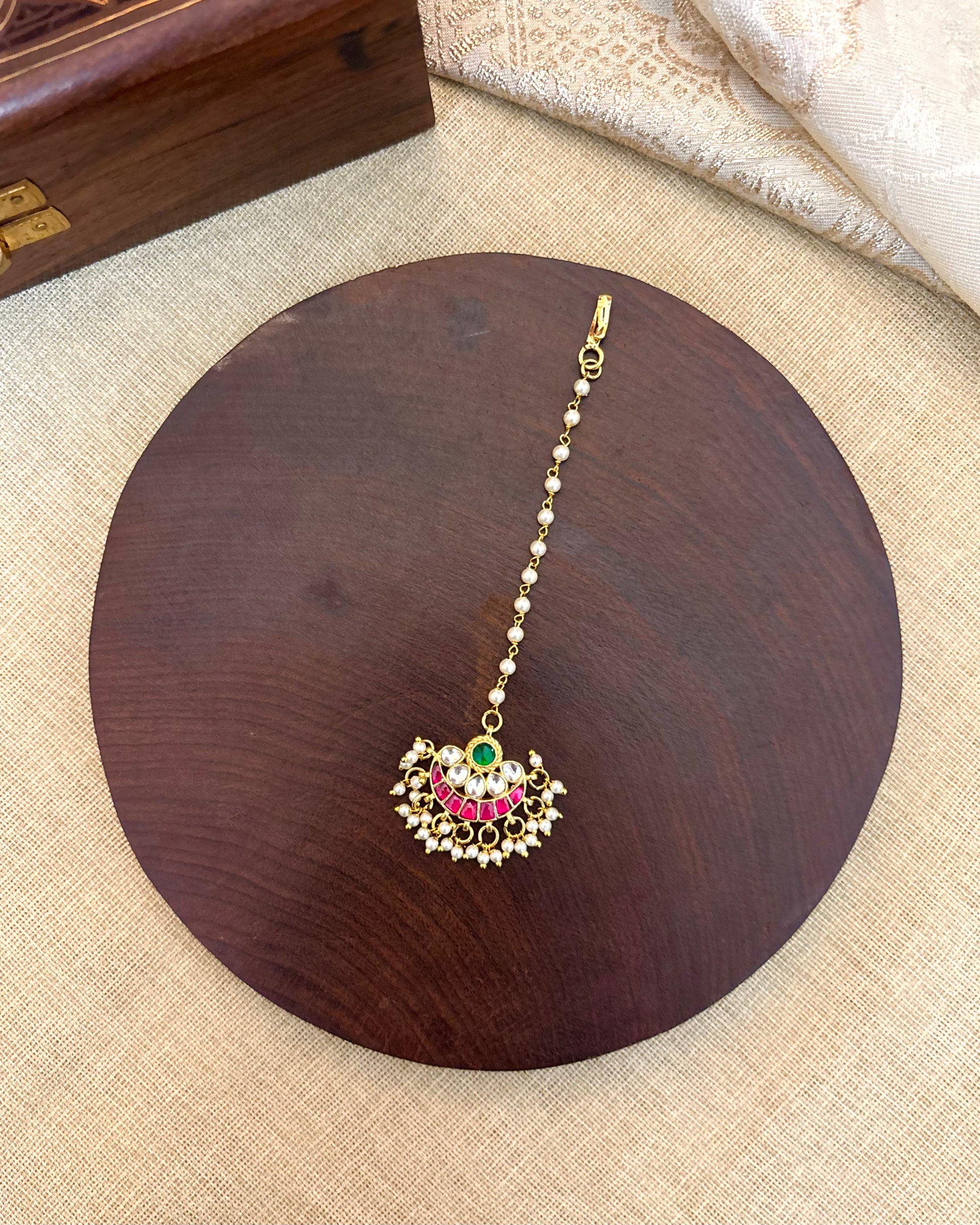 The beautifully crafted pendant features intricate Kundan work with rich pink, white and green enamel accents, adding a touch of heritage charm. The lower edge is adorned with delicate pearl clusters, enhancing its luxurious appeal. A single-strand pearl chain gracefully connects the pendant to the hook, ensuring a secure and elegant fit on the forehead. Perfect for weddings and festive occasions, this maang tikka is designed to elevate your ethnic look with royal sophistication.