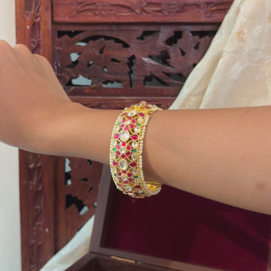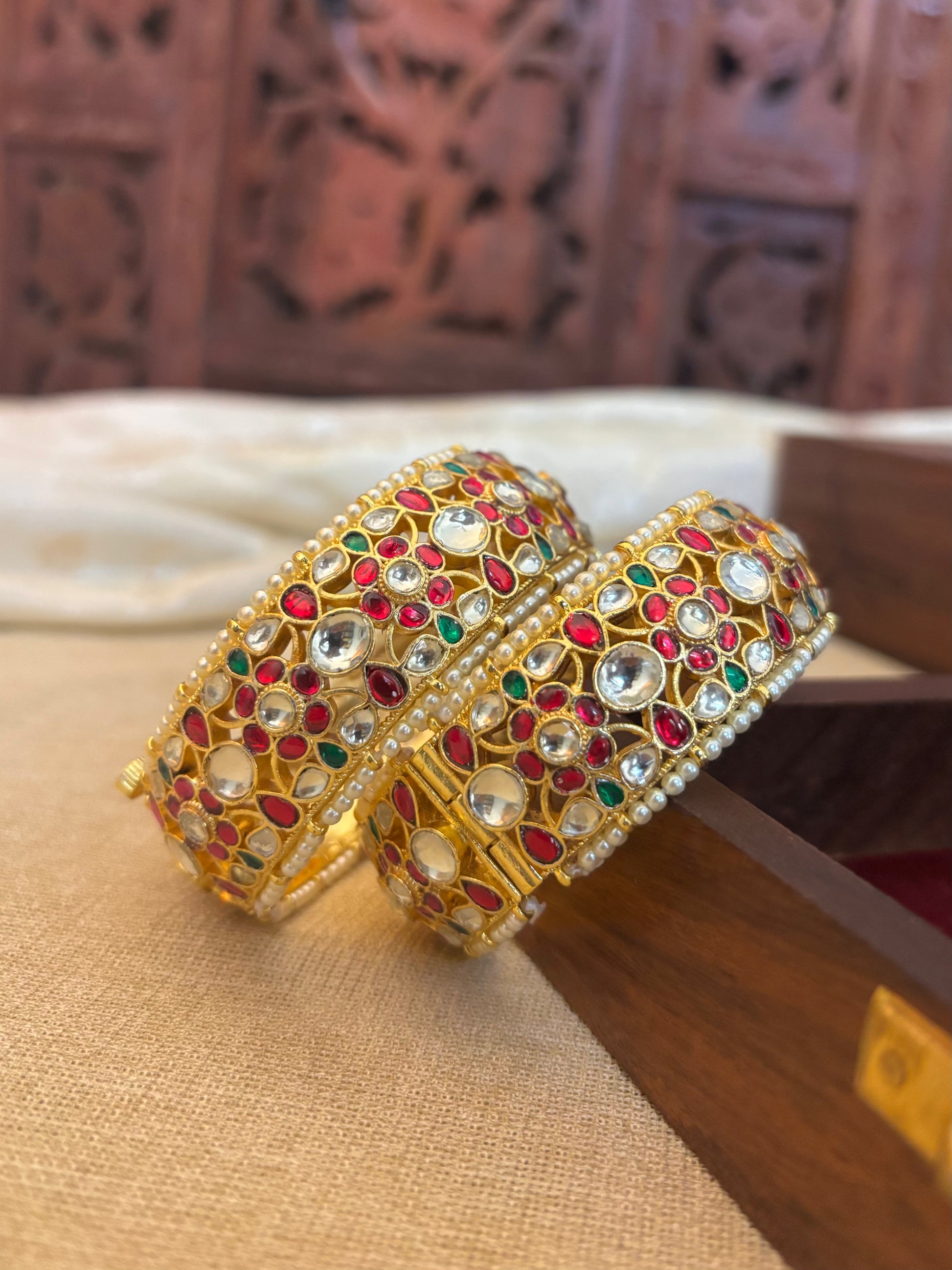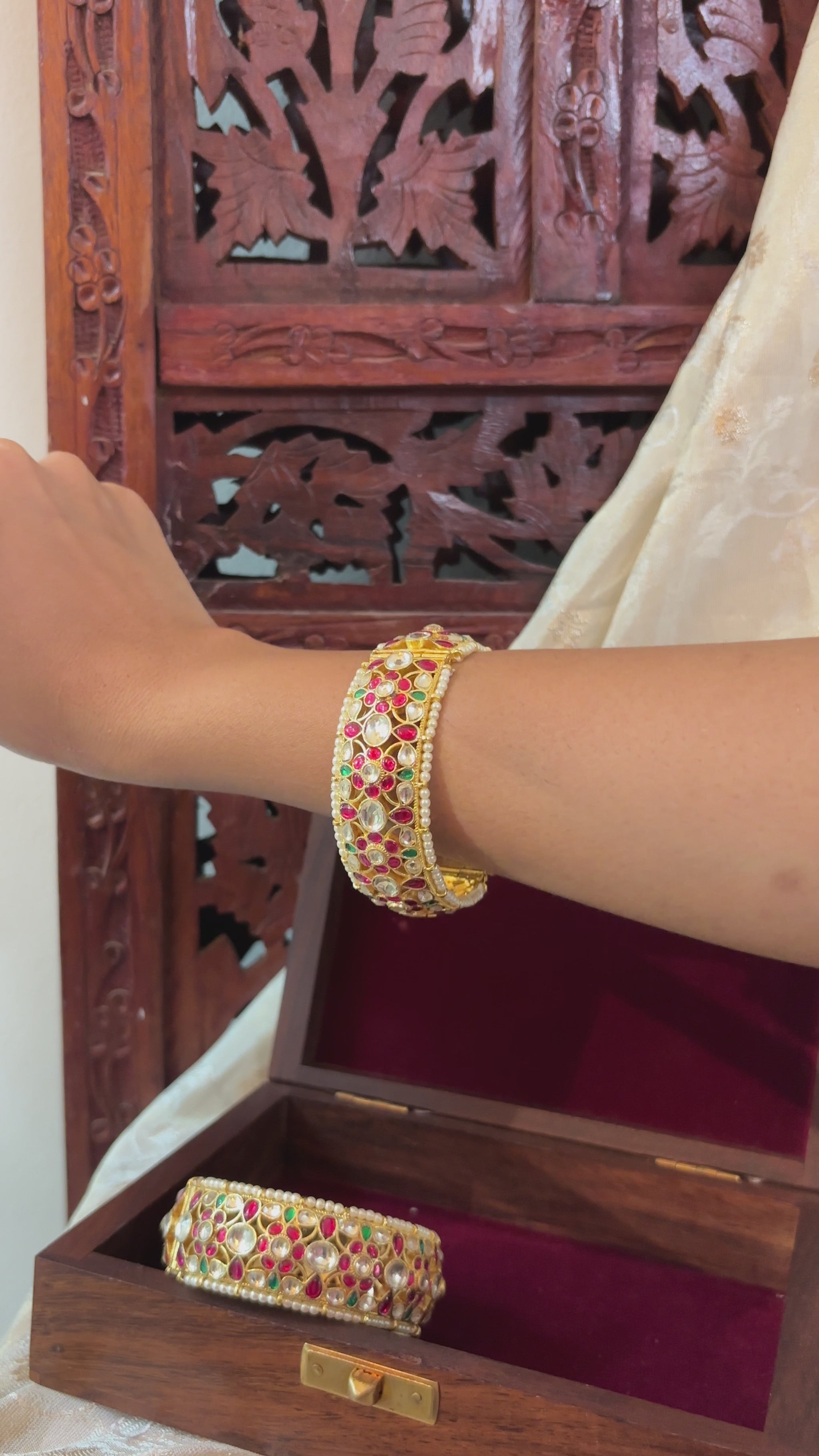 Jadau Kundan Gold Plated Bangles — Multicolor with Pearl Detailing | BA016