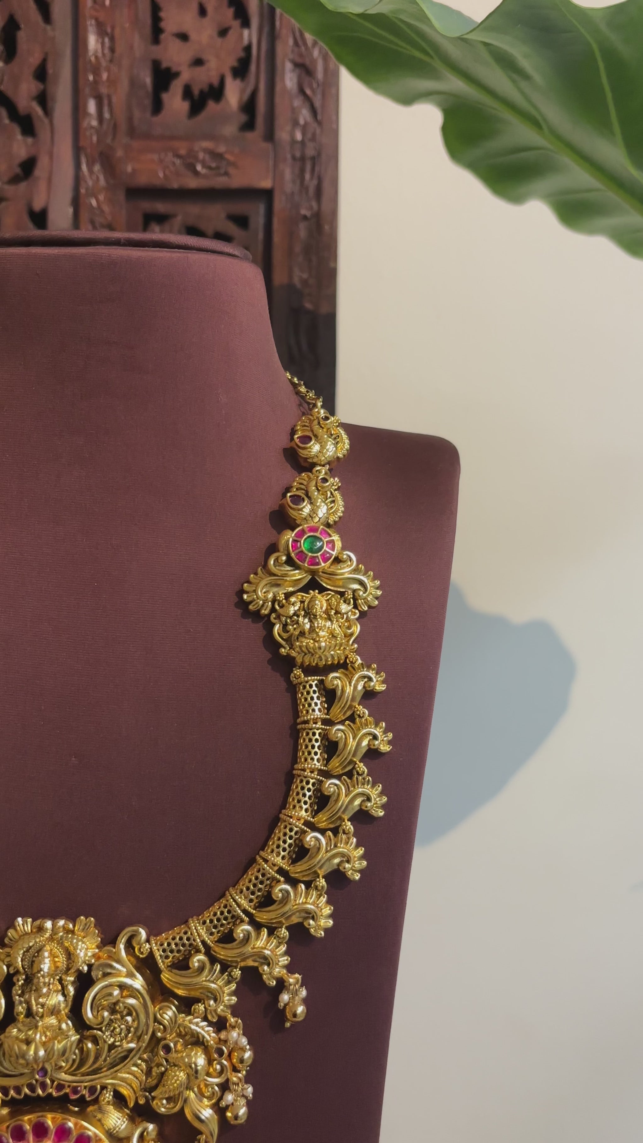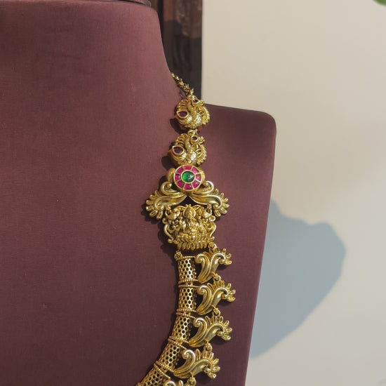 This set comes with matching Lakshmi earrings, completing the look with perfect harmony. Ideal for weddings, festive occasions, and South Indian bridal styling, this necklace set beautifully enhances any traditional ensemble with its grandeur and intricate craftsmanship.