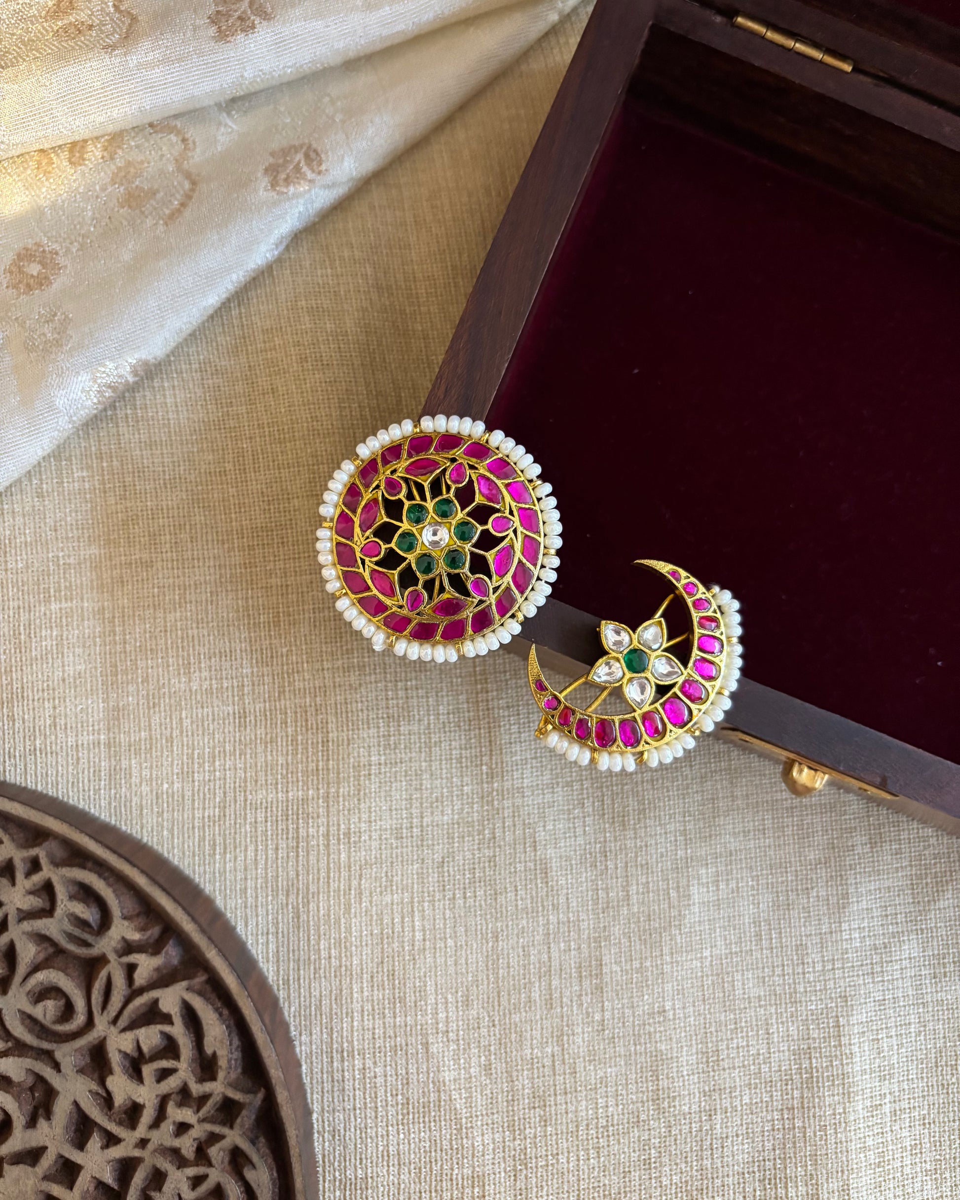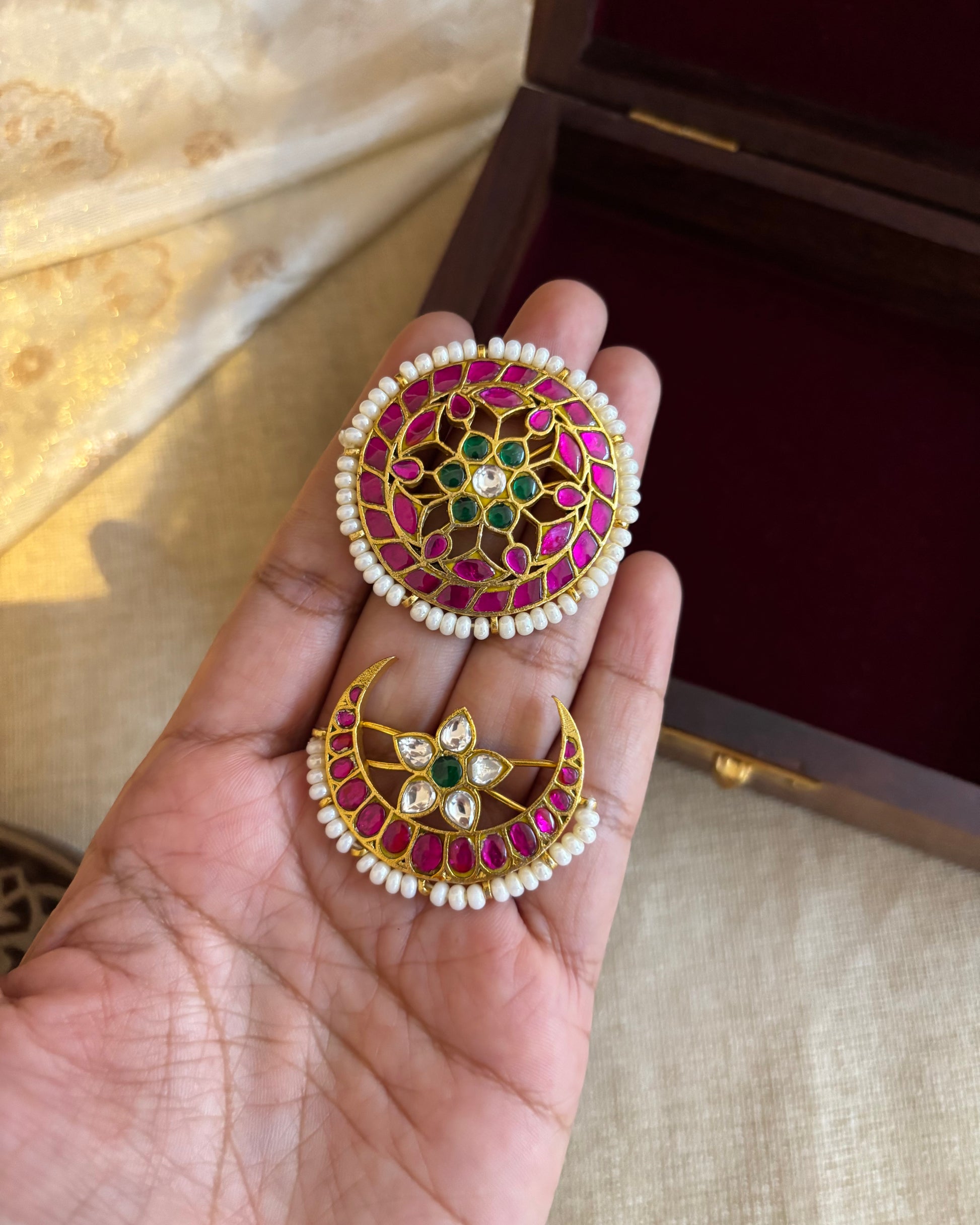 Inspired by celestial motifs, this handcrafted Jadau Kundan Sun & Moon Hair Accessory set brings together timeless tradition and symbolic beauty. Made with intricate kundan work and finished in radiant gold plating, both pieces are beautifully detailed — the sun representing energy and radiance, and the moon symbolizing grace and calm.