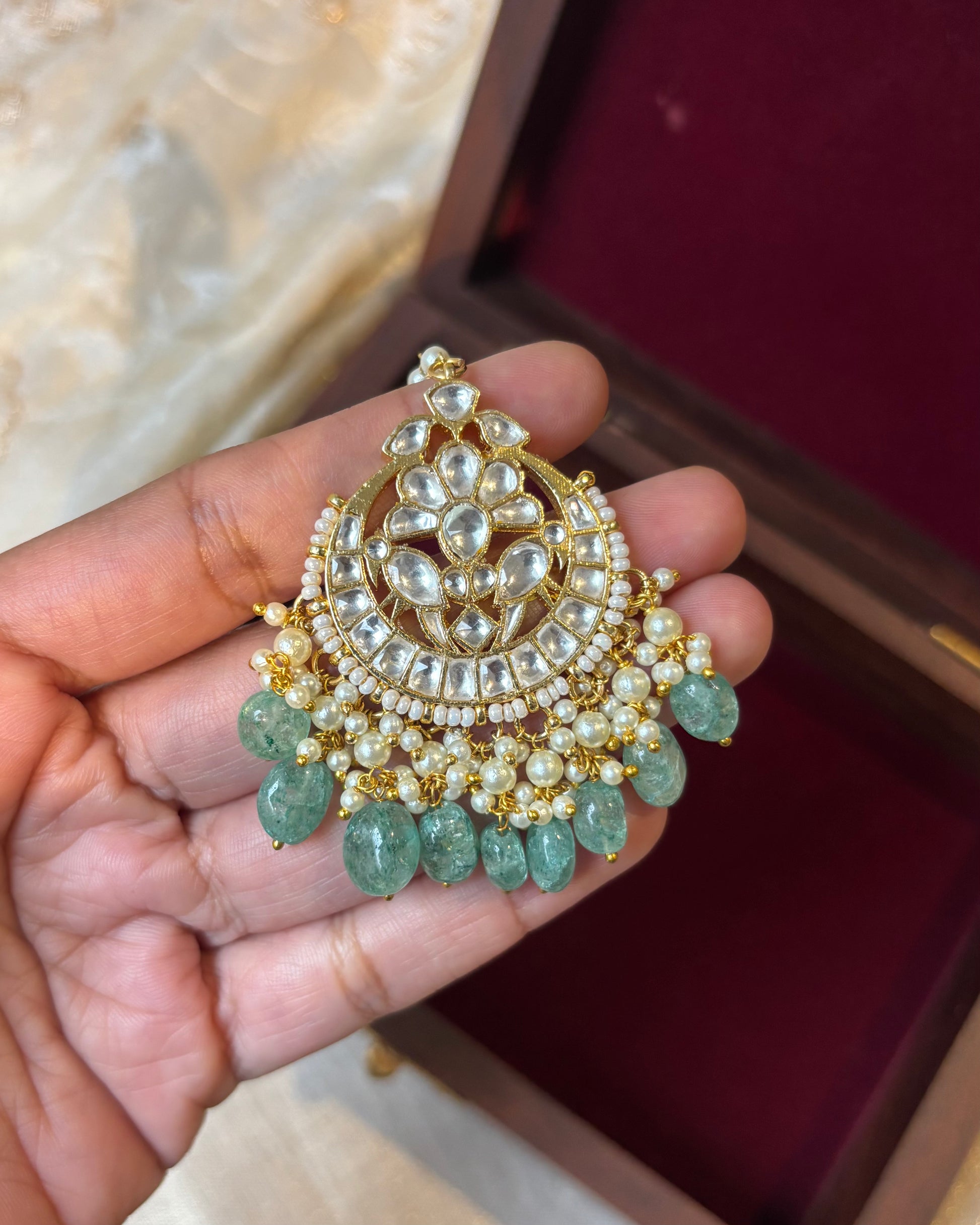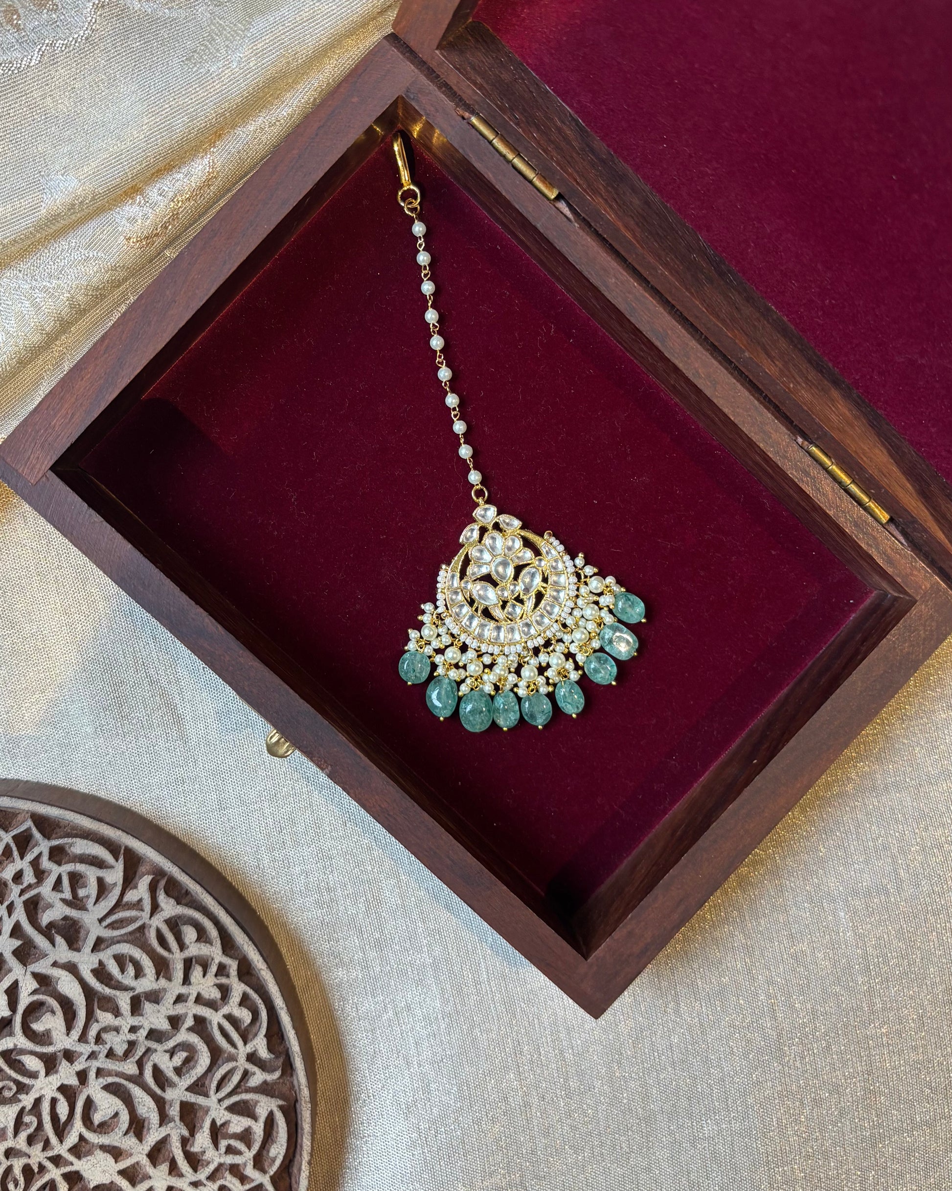 Inspired by timeless heritage, this Jadau Kundan maang tikka features an enchanting peacock motif at its heart, symbolizing purity and grace. Handcrafted with gold plating, the intricate detailing is accentuated by polished Kundan stones, while the delicate pearl and bead drops add a touch of regality. A perfect blend of tradition and elegance, this exquisite piece is ideal for weddings, festive celebrations, and cultural occasions, making it a must-have for any jewelry collection.