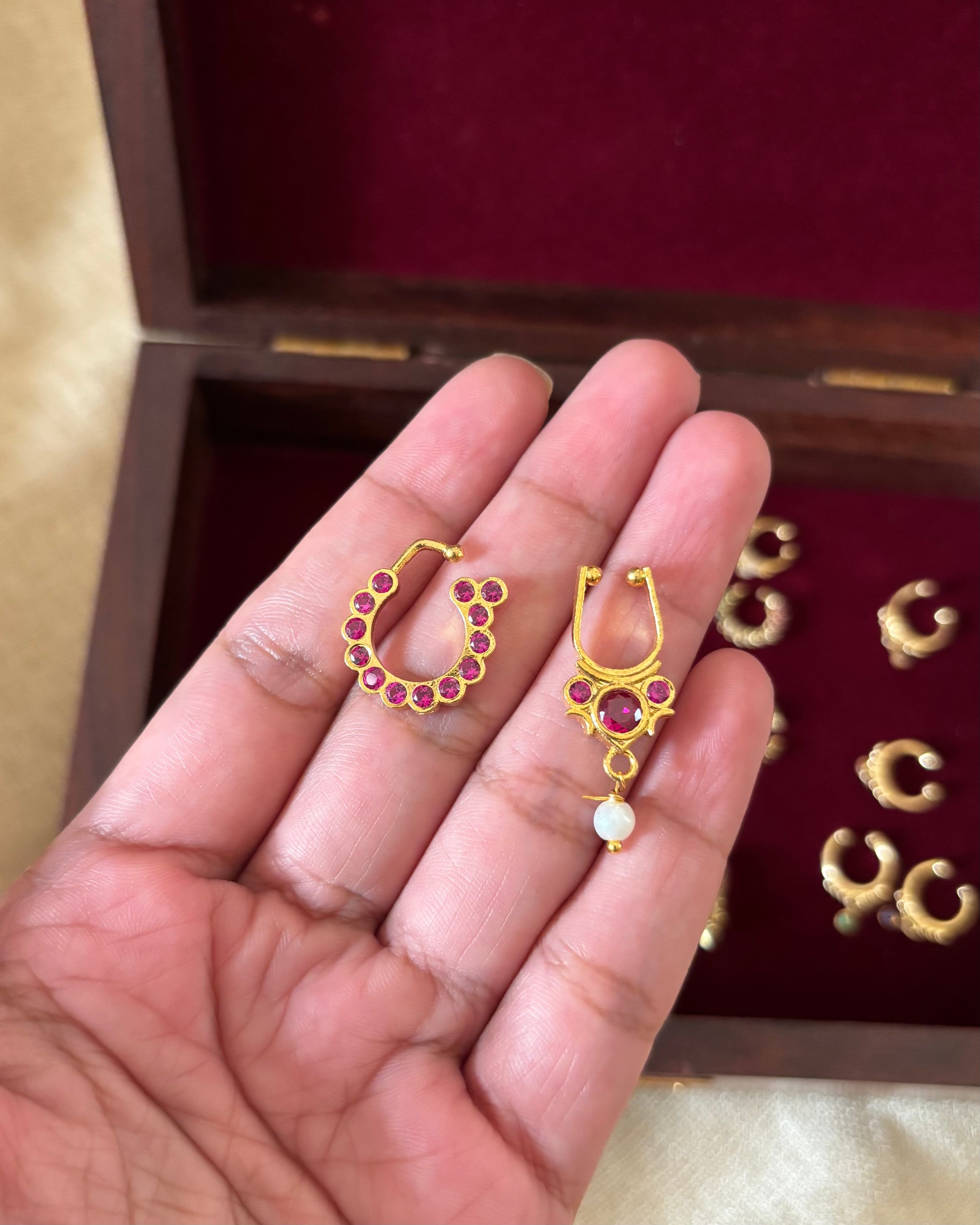 A delicate blend of tradition and charm, this nosepin is a graceful addition to your festive or bridal look. Handcrafted with precision, it features intricate work set in a subtle base that enhances its timeless appeal. Whether you're a bride looking to complete your ensemble or simply adding a touch of tradition to your style, this nosepin is the perfect understated statement. Lightweight, comfortable, and beautiful — it’s elegance in the tiniest detail.