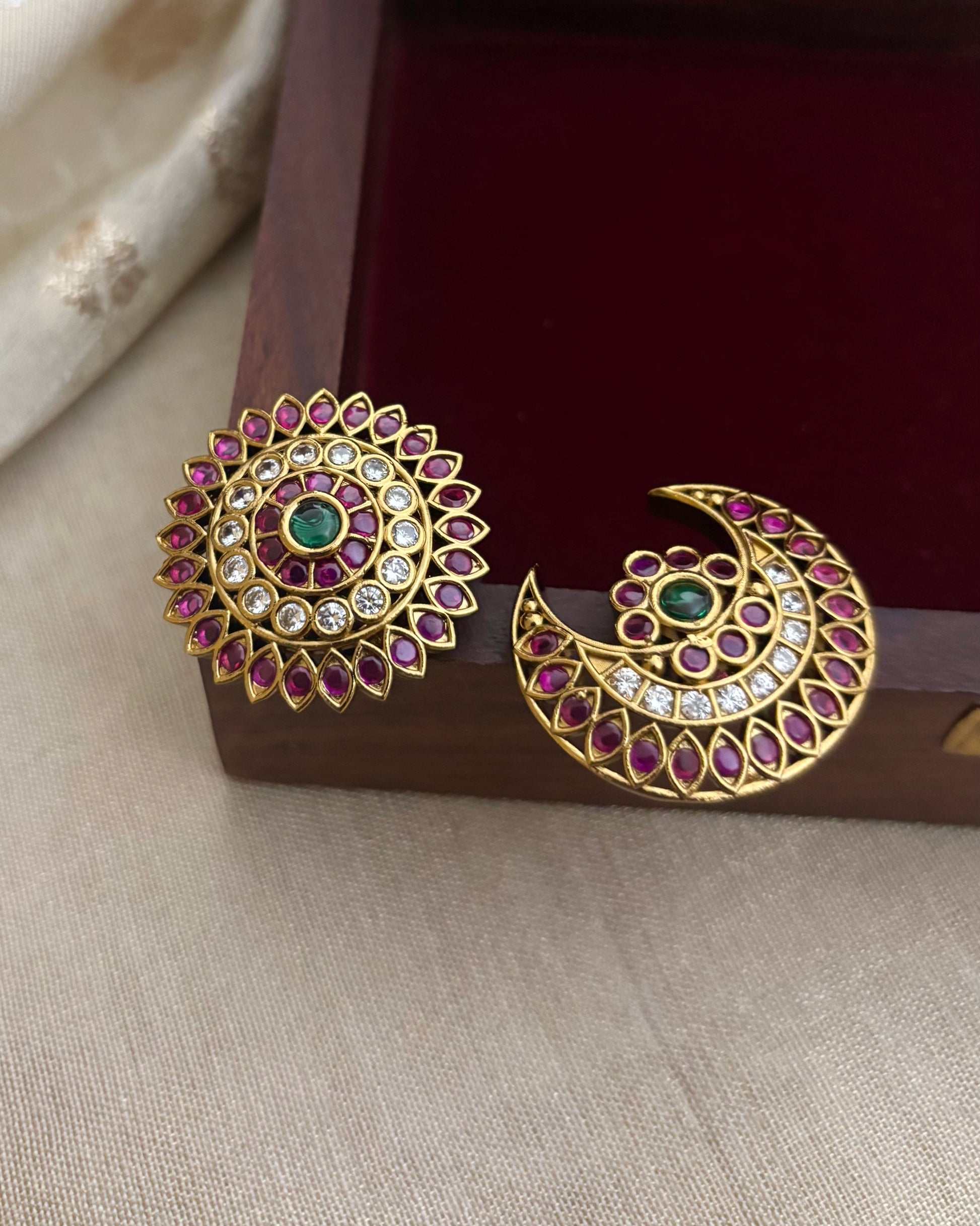 Elegant and symbolic, this pair of Sun & Moon Hair Pendants is crafted in a timeless kemp finish, bringing together celestial beauty with traditional craftsmanship. The intricate design is enhanced with delicate detailing, giving it a soft, regal touch that complements bridal and festive hairstyles.