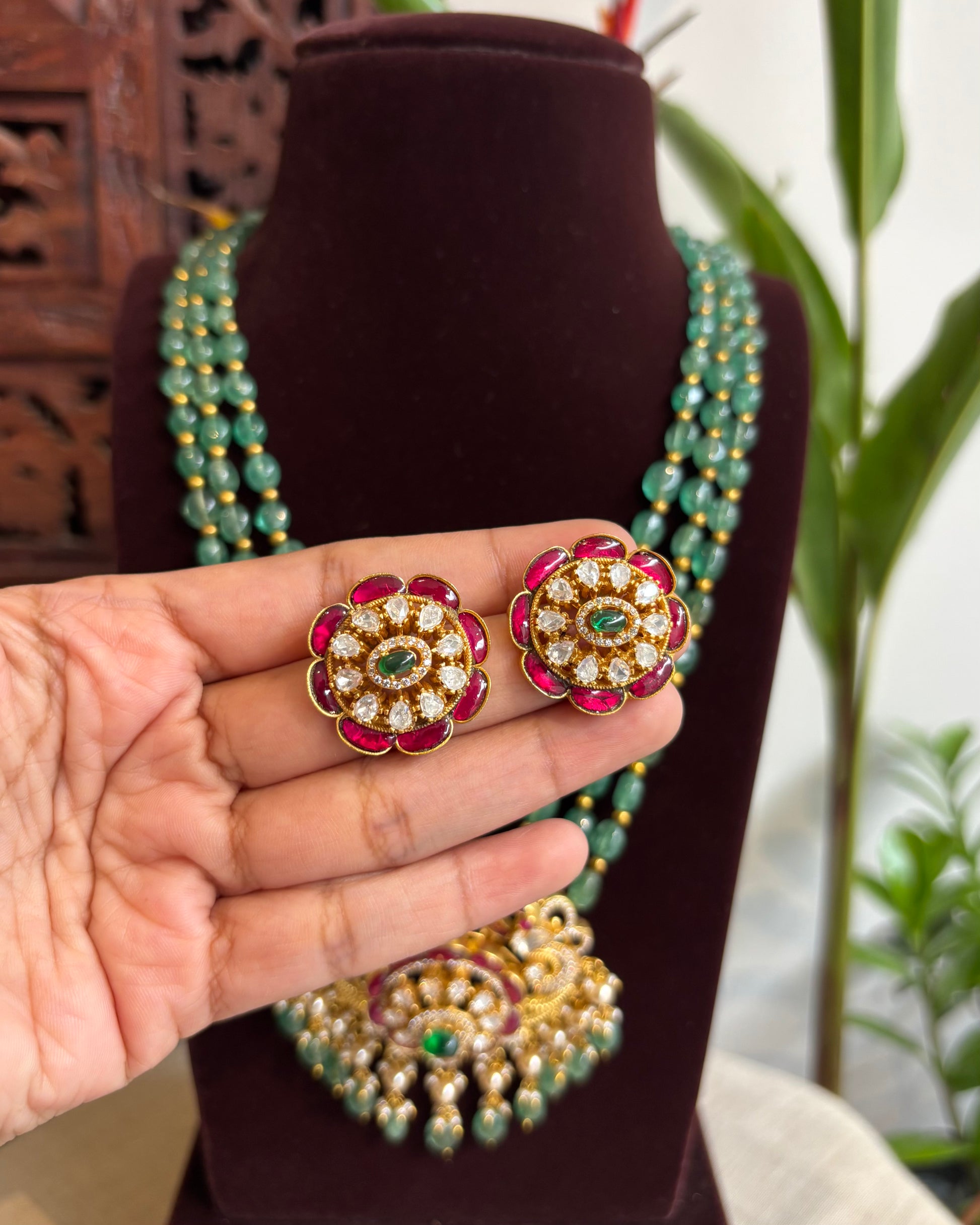 Jadau Kundan Beads Haram – Green Strawberry Beads Necklace Set | NC202