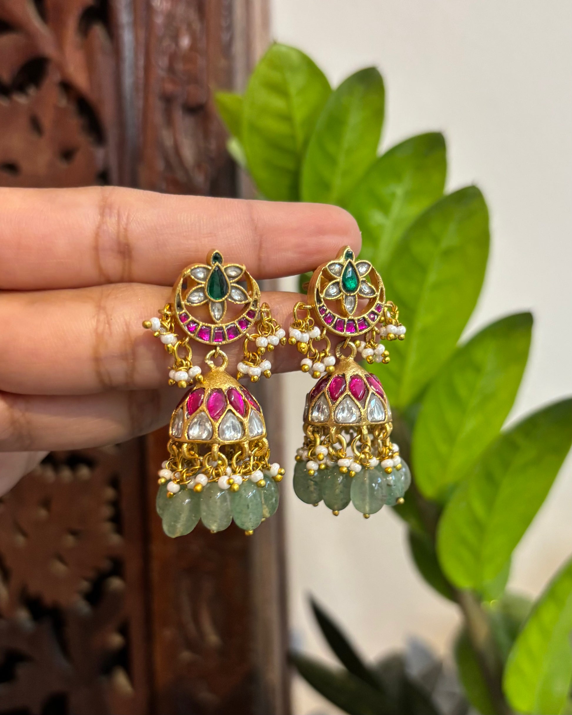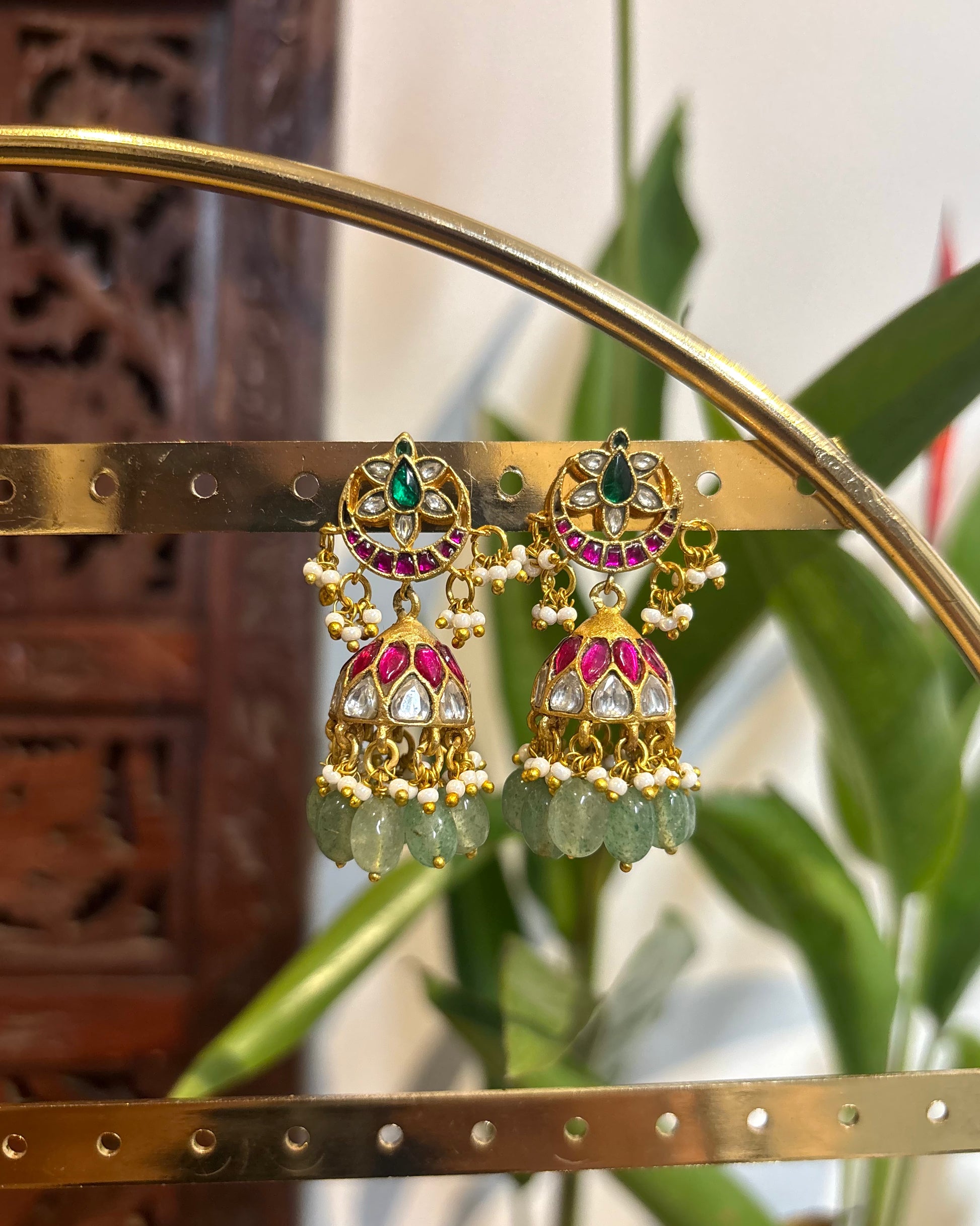 Floral Minimal Multicolor Jadau Kundan Jhumkas with Pearl Hangings | ER147