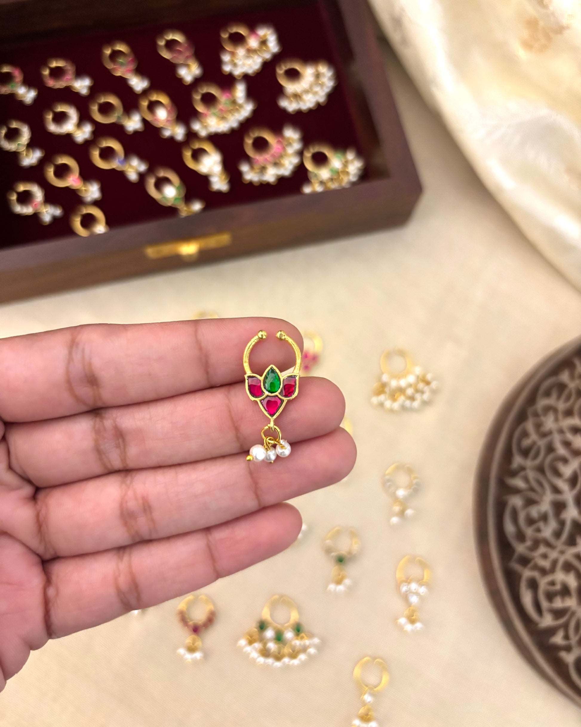 A delicate blend of tradition and charm, this nosepin is a graceful addition to your festive or bridal look. Handcrafted with precision, it features intricate work set in a subtle base that enhances its timeless appeal. Whether you're a bride looking to complete your ensemble or simply adding a touch of tradition to your style, this nosepin is the perfect understated statement. Lightweight, comfortable, and beautiful — it’s elegance in the tiniest detail.
