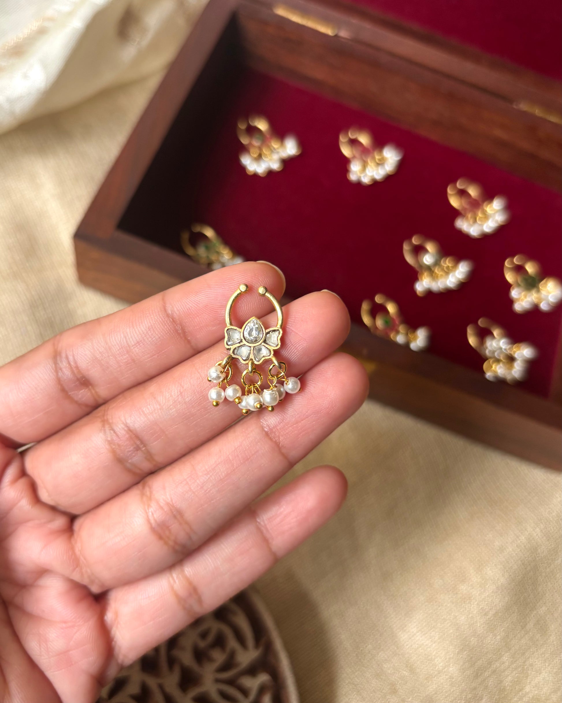 A delicate blend of tradition and charm, this nosepin is a graceful addition to your festive or bridal look. Handcrafted with precision, it features intricate work set in a subtle base that enhances its timeless appeal. Whether you're a bride looking to complete your ensemble or simply adding a touch of tradition to your style, this nosepin is the perfect understated statement. Lightweight, comfortable, and beautiful — it’s elegance in the tiniest detail.