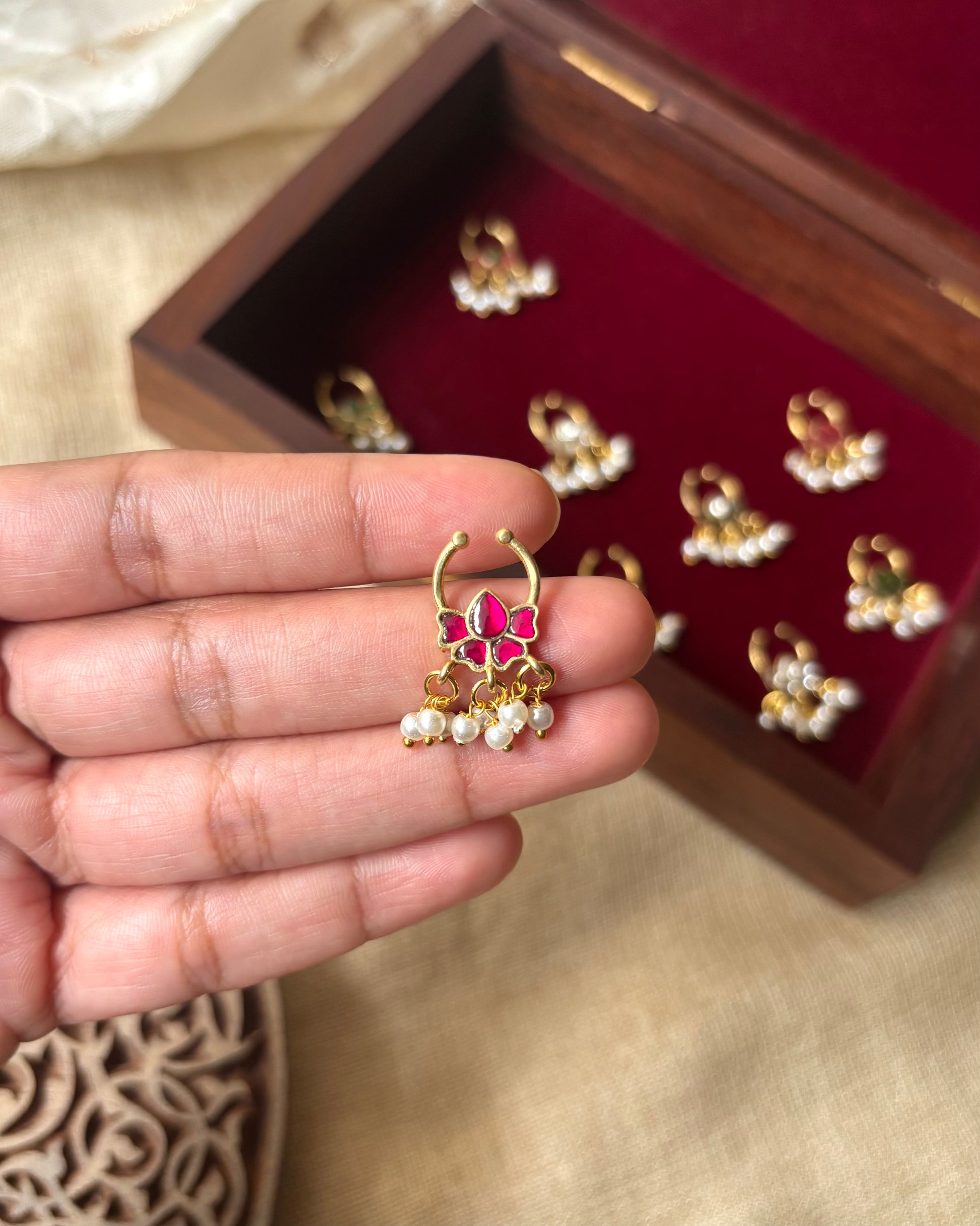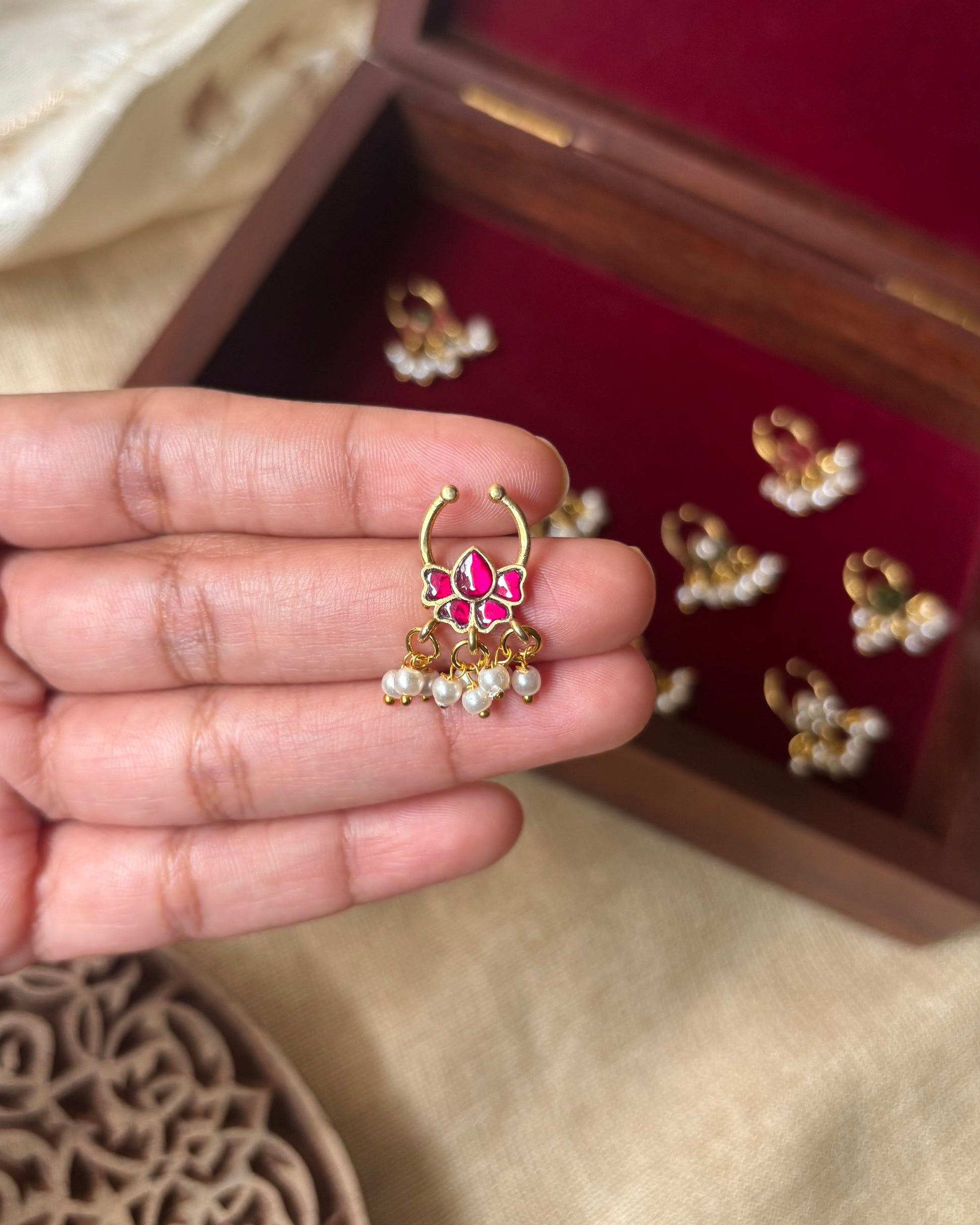 A delicate blend of tradition and charm, this nosepin is a graceful addition to your festive or bridal look. Handcrafted with precision, it features intricate work set in a subtle base that enhances its timeless appeal. Whether you're a bride looking to complete your ensemble or simply adding a touch of tradition to your style, this nosepin is the perfect understated statement. Lightweight, comfortable, and beautiful — it’s elegance in the tiniest detail.