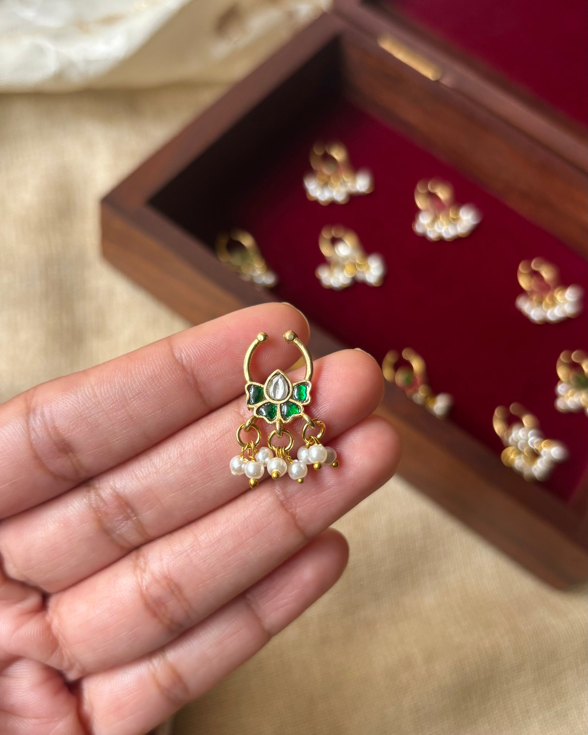 A delicate blend of tradition and charm, this nosepin is a graceful addition to your festive or bridal look. Handcrafted with precision, it features intricate work set in a subtle base that enhances its timeless appeal. Whether you're a bride looking to complete your ensemble or simply adding a touch of tradition to your style, this nosepin is the perfect understated statement. Lightweight, comfortable, and beautiful — it’s elegance in the tiniest detail.