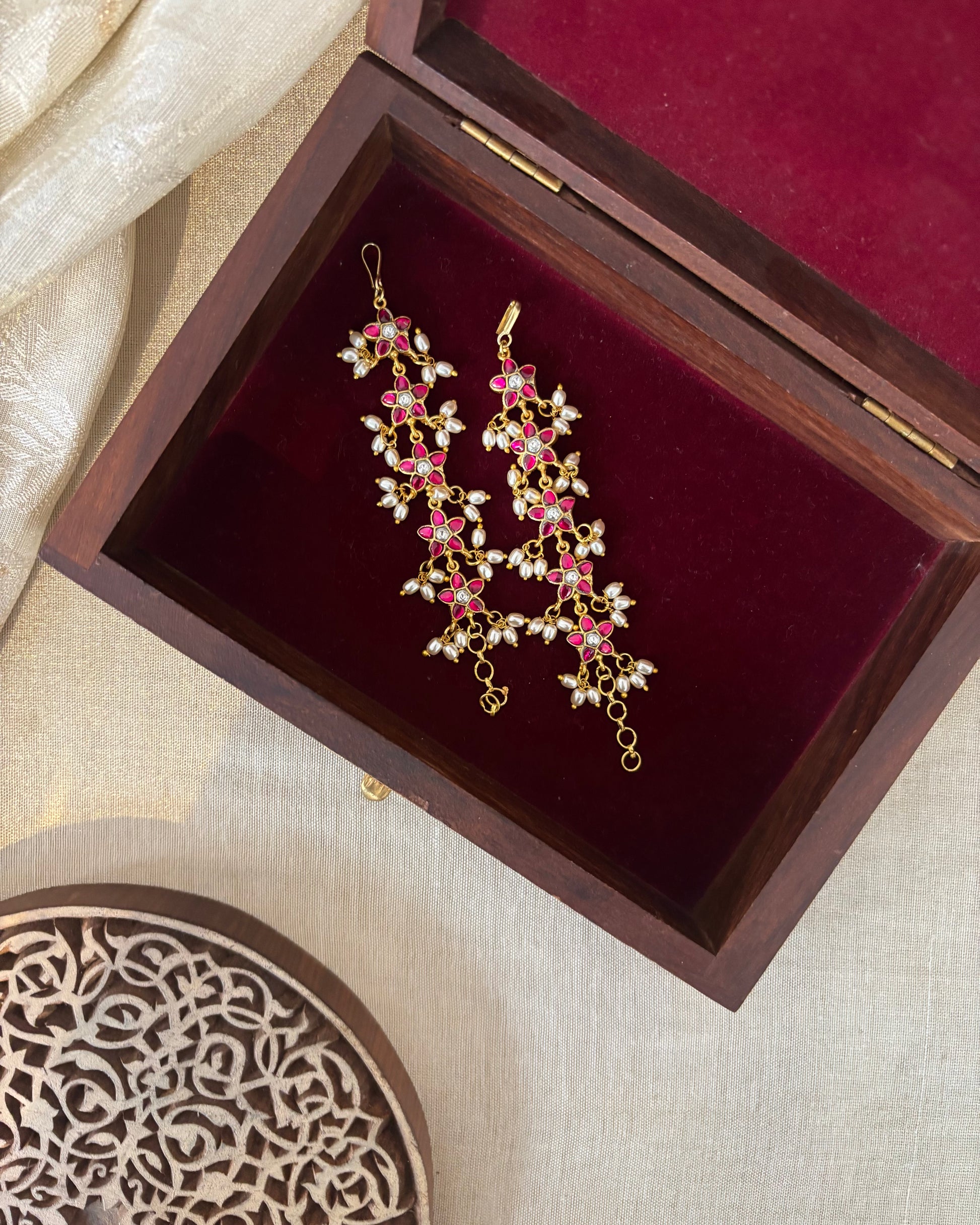 Gold-plated for a rich, timeless look, this ear chain is perfect for pairing with maang tikkas, hair accessories, or traditional earrings, making it a versatile addition to any bridal or festive ensemble. Lightweight and thoughtfully designed, it frames the face beautifully while staying comfortably in place.