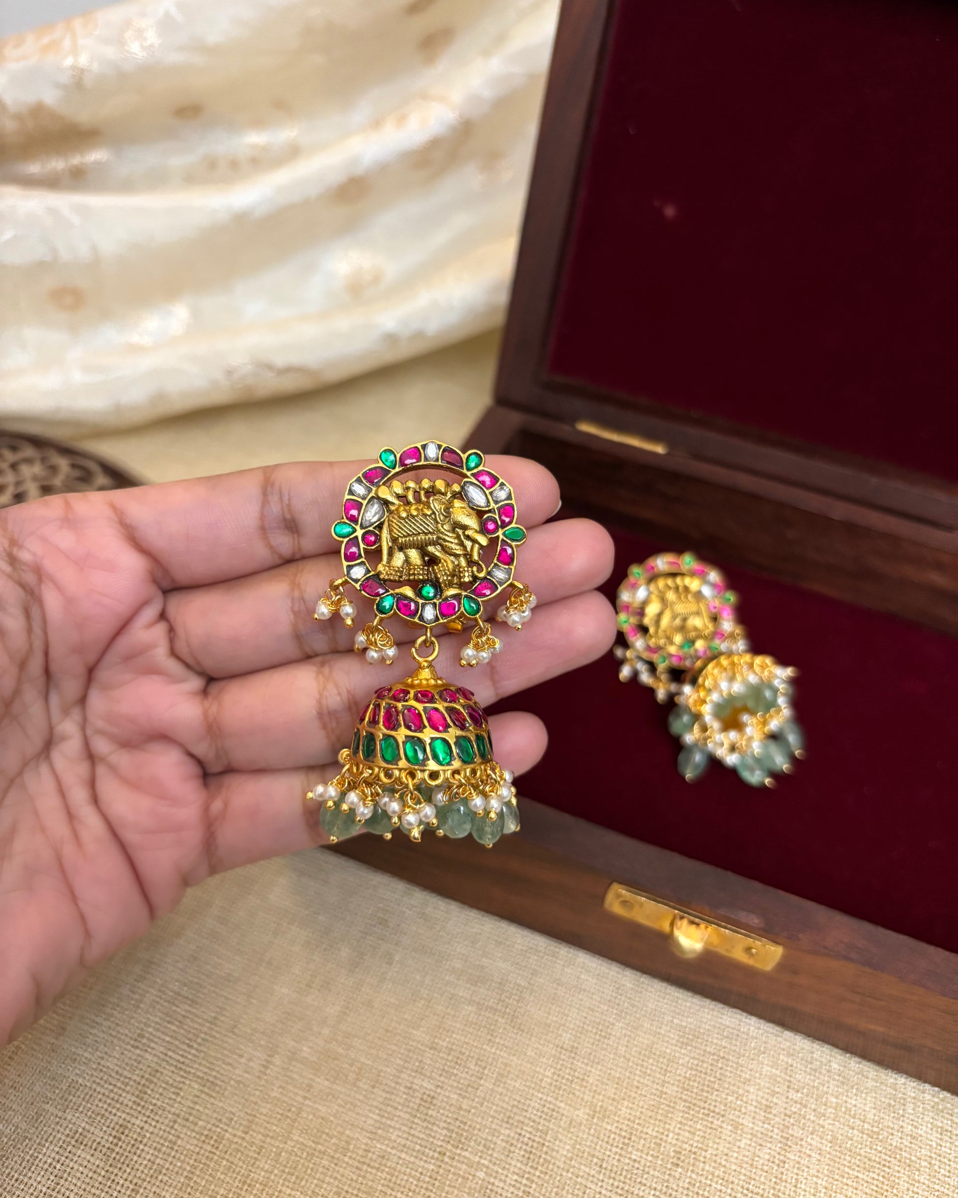 These stunning Elephant Multicolor Jhumkas blend tradition with artistic elegance. The top features a delicately crafted elephant-shaped motif, symbolizing purity and grace, embellished with multicolor Kundan stones. The intricately detailed jhumkas below are a true work of art, finished with tiny pearl hangings that sway with every move, adding charm and softness.