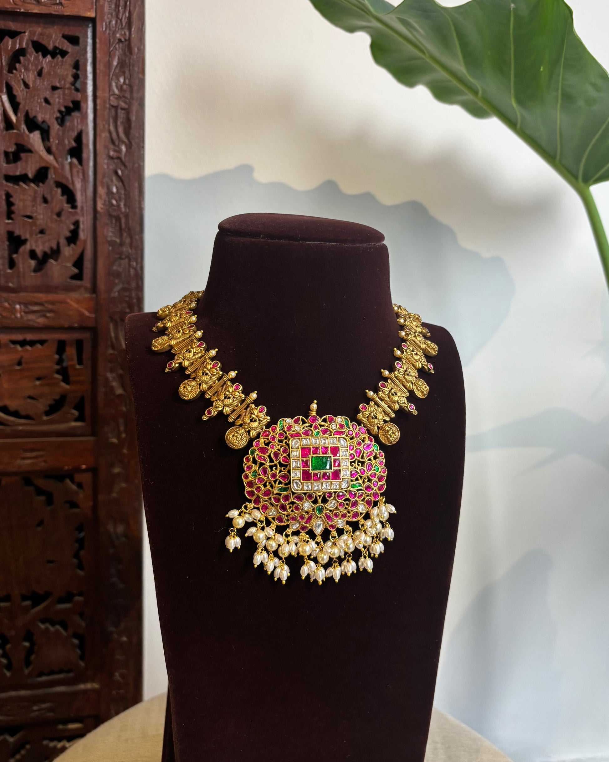 We took the auspicious, timeless beauty of the Kaasu Malai and elevated it with a massive, intricate Jadau Kundan Statement Pendant.