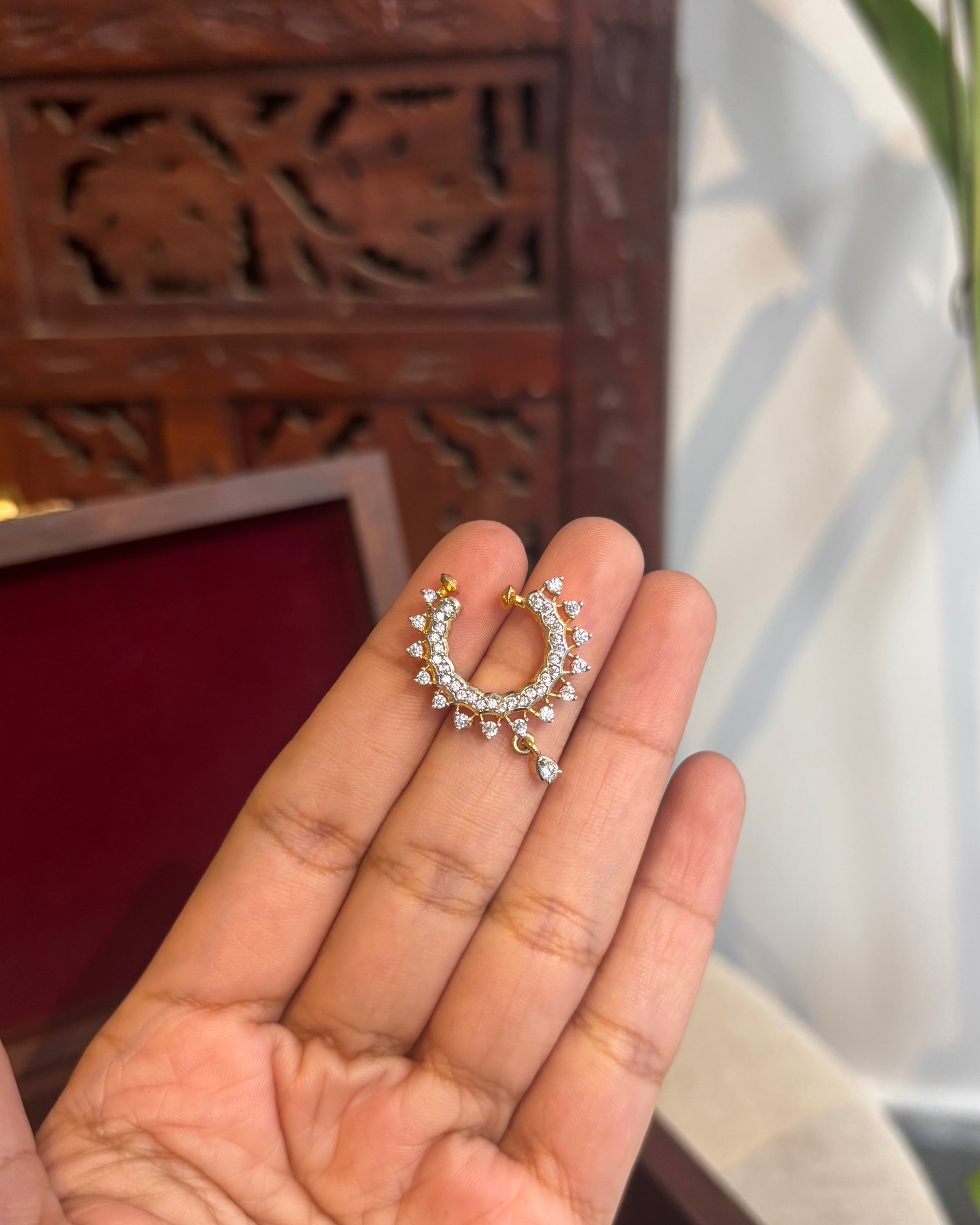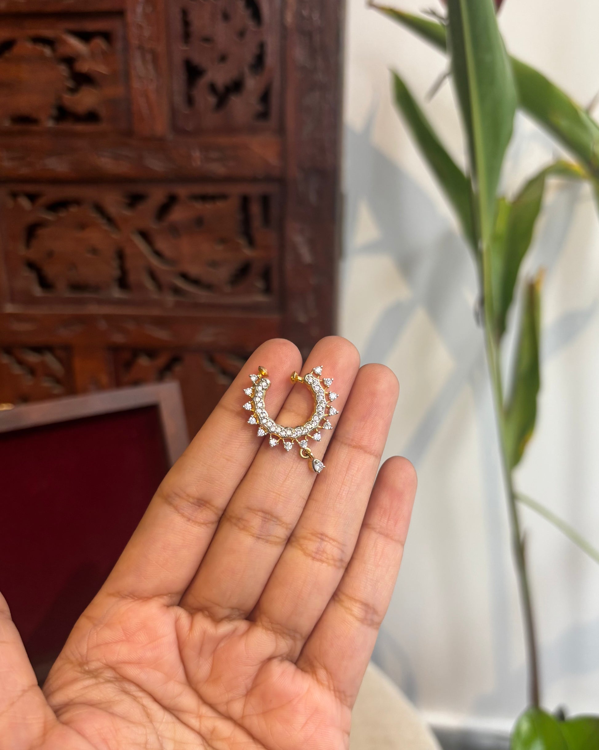 A delicate blend of tradition and charm, this nosepin is a graceful addition to your festive or bridal look. Handcrafted with precision, it features intricate work set in a subtle base that enhances its timeless appeal. Whether you're a bride looking to complete your ensemble or simply adding a touch of tradition to your style, this nosepin is the perfect understated statement. Lightweight, comfortable, and beautiful — it’s elegance in the tiniest detail.