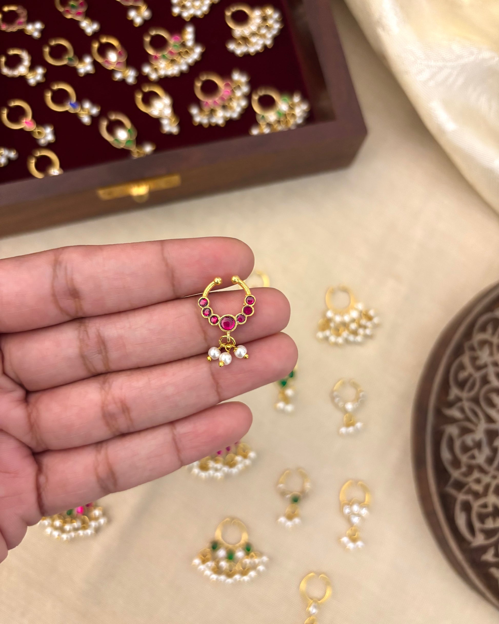 A delicate blend of tradition and charm, this nosepin is a graceful addition to your festive or bridal look. Handcrafted with precision, it features intricate work set in a subtle base that enhances its timeless appeal. Whether you're a bride looking to complete your ensemble or simply adding a touch of tradition to your style, this nosepin is the perfect understated statement. Lightweight, comfortable, and beautiful — it’s elegance in the tiniest detail.