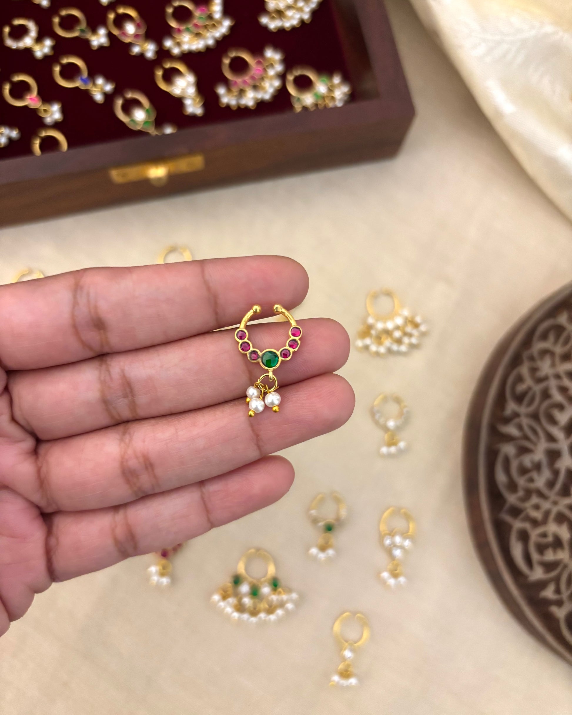 A delicate blend of tradition and charm, this nosepin is a graceful addition to your festive or bridal look. Handcrafted with precision, it features intricate work set in a subtle base that enhances its timeless appeal. Whether you're a bride looking to complete your ensemble or simply adding a touch of tradition to your style, this nosepin is the perfect understated statement. Lightweight, comfortable, and beautiful — it’s elegance in the tiniest detail.