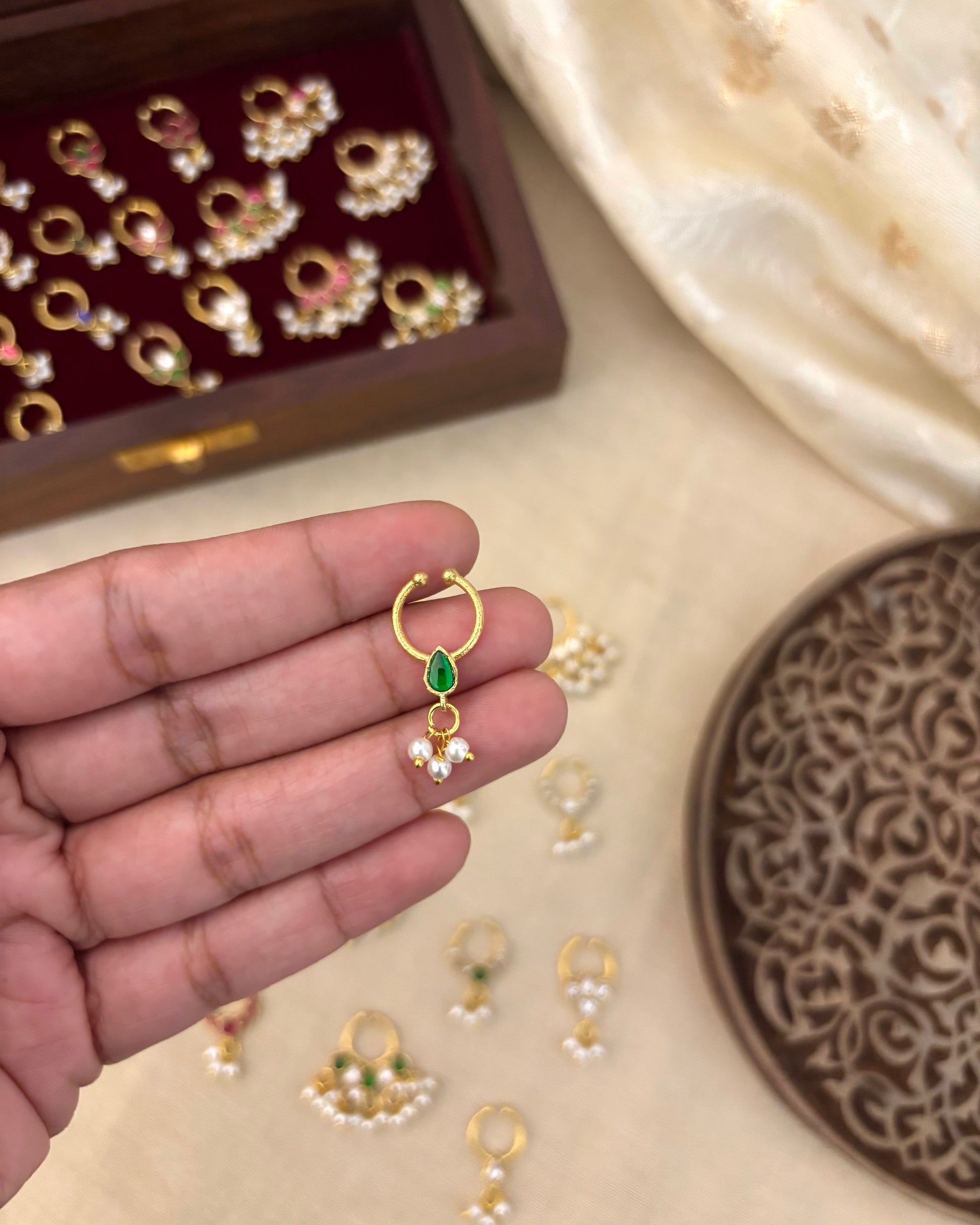 A delicate blend of tradition and charm, this nosepin is a graceful addition to your festive or bridal look. Handcrafted with precision, it features intricate work set in a subtle base that enhances its timeless appeal. Whether you're a bride looking to complete your ensemble or simply adding a touch of tradition to your style, this nosepin is the perfect understated statement. Lightweight, comfortable, and beautiful — it’s elegance in the tiniest detail.
