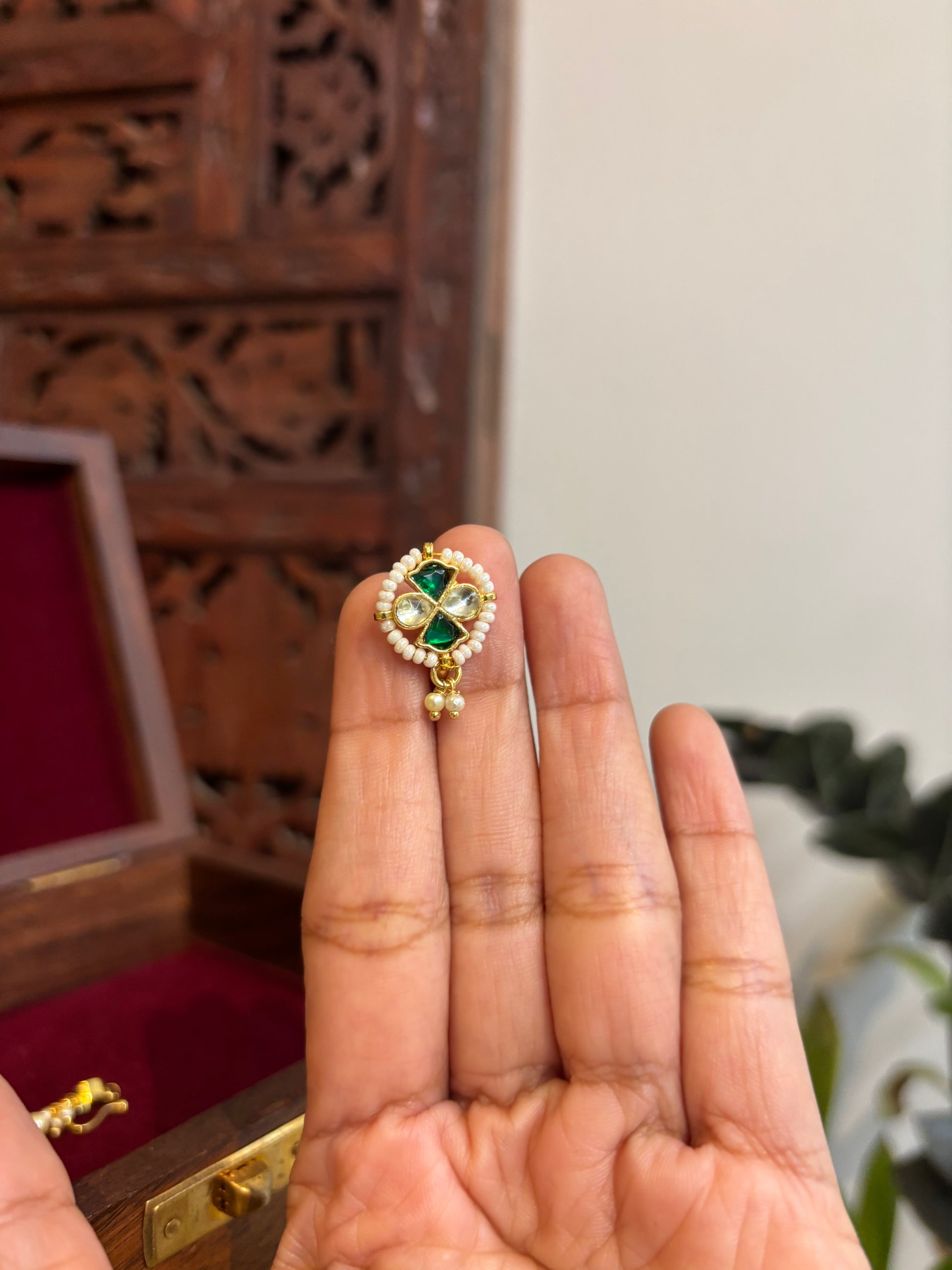 A delicate blend of tradition and charm, this nosepin is a graceful addition to your festive or bridal look. Handcrafted with precision, it features intricate work set in a subtle base that enhances its timeless appeal. Whether you're a bride looking to complete your ensemble or simply adding a touch of tradition to your style, this nosepin is the perfect understated statement. Lightweight, comfortable, and beautiful — it’s elegance in the tiniest detail.