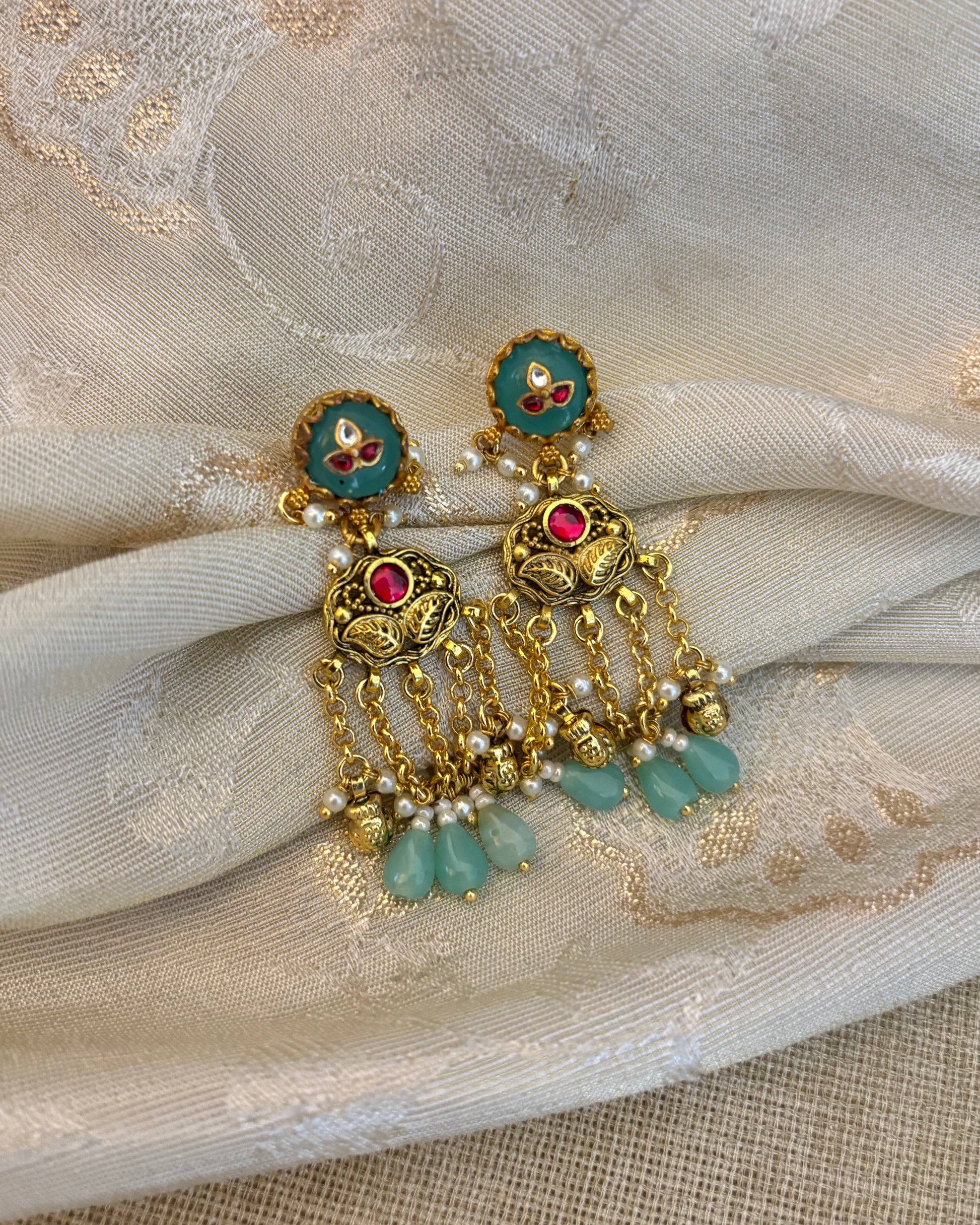 The vibrant colors and elegant silhouette make these earrings a perfect choice for weddings, festive occasions, or cultural celebrations. Whether styled with a kanjeevaram saree or an embellished lehenga, these jhumkas are sure to draw admiration.