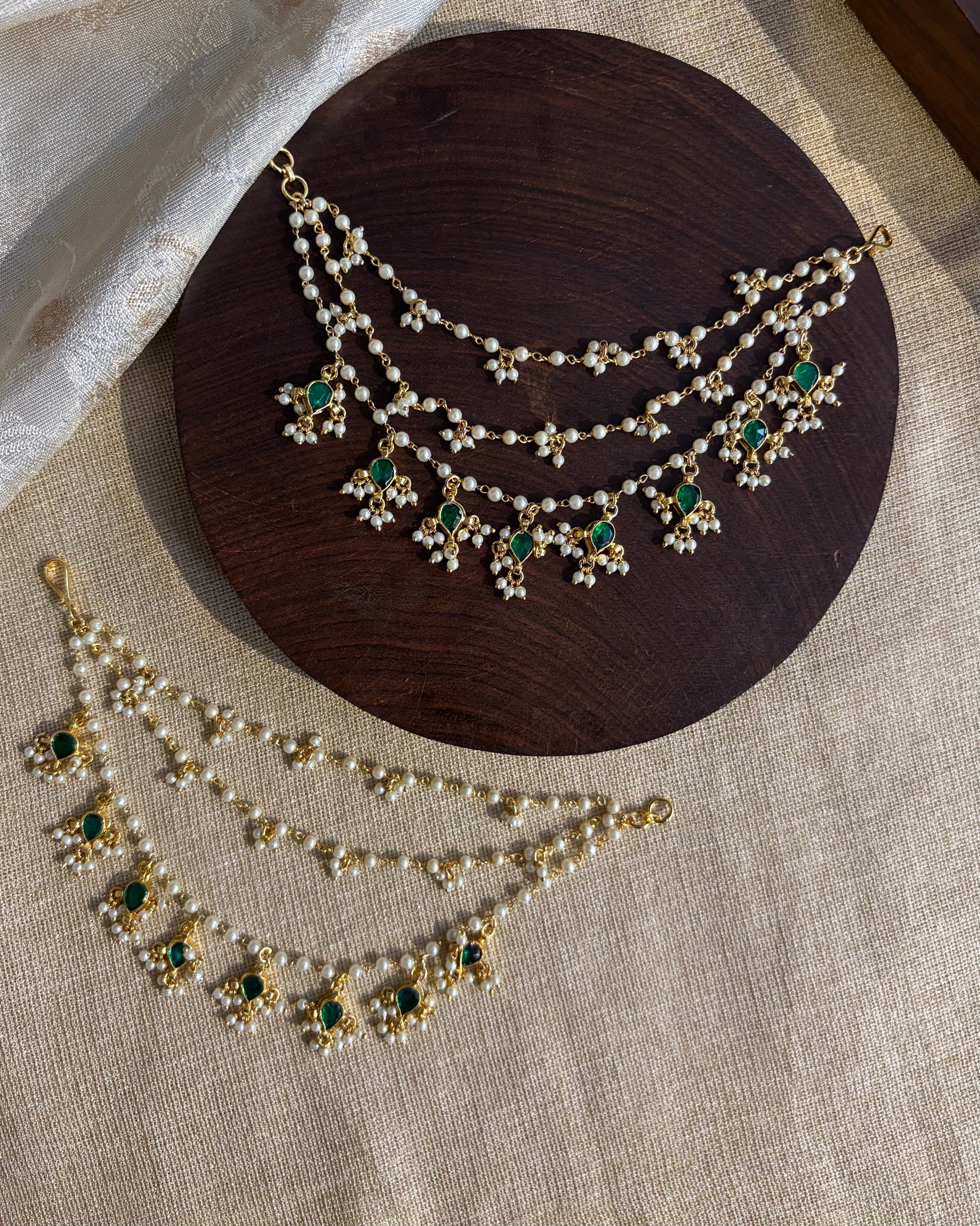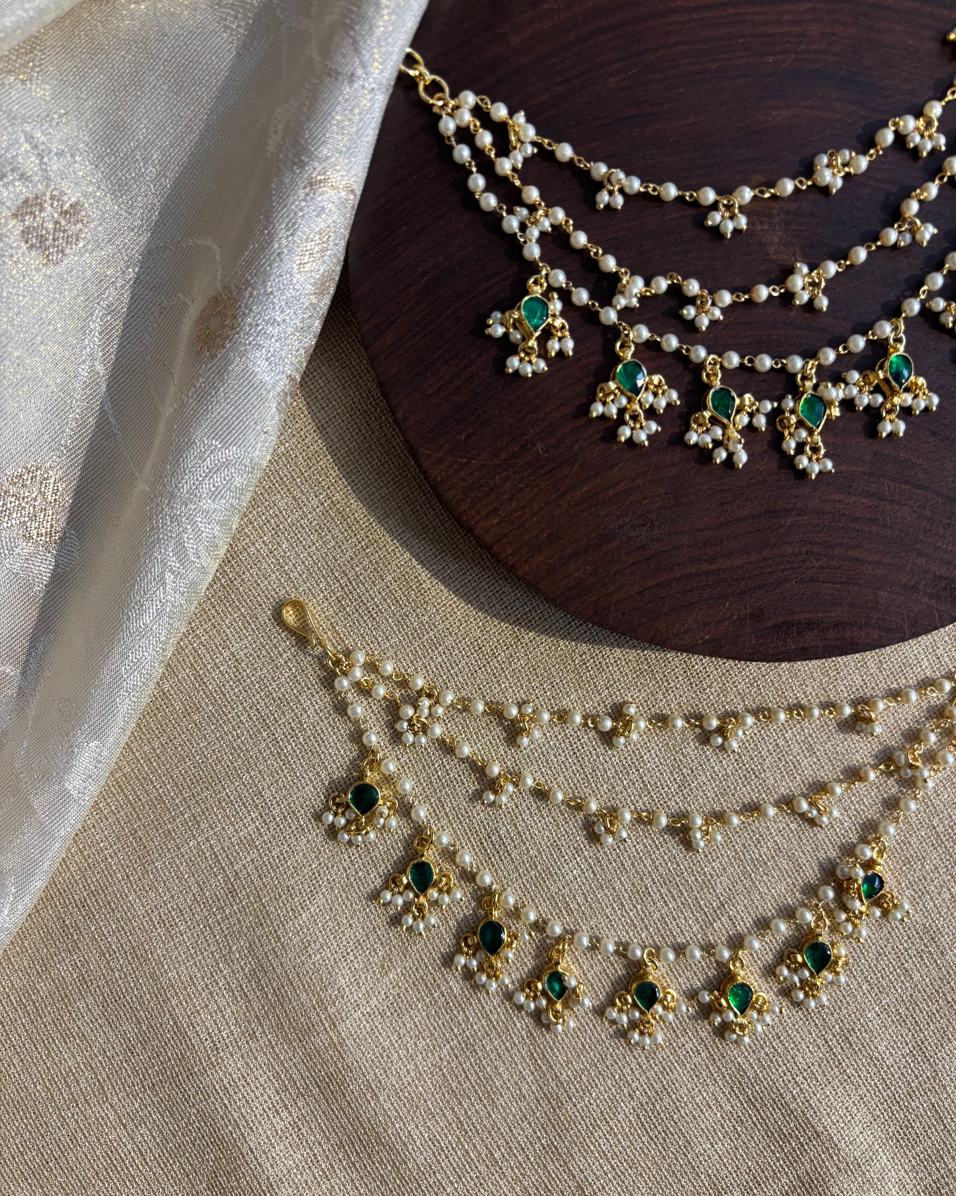 A delicate balance of tradition and minimalism, this handcrafted three-layer ear chain is adorned with white and green Jadau Kundan stones. Each layer features fine pearl strings that drape gracefully, adding softness and charm to your look.