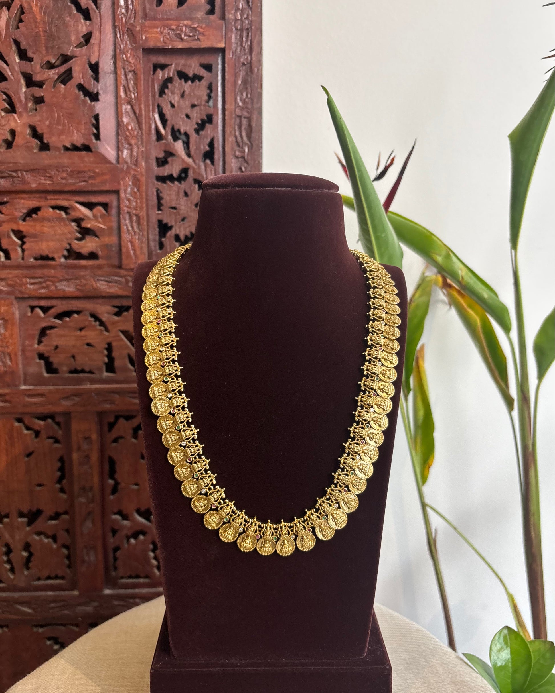 Embrace the Minimal Lakshmi Kaasu Haram. We’ve taken the grandeur of the classic heavy coin necklace and reimagined it into a sleek, lightweight design that fits perfectly into the modern woman's wardrobe.