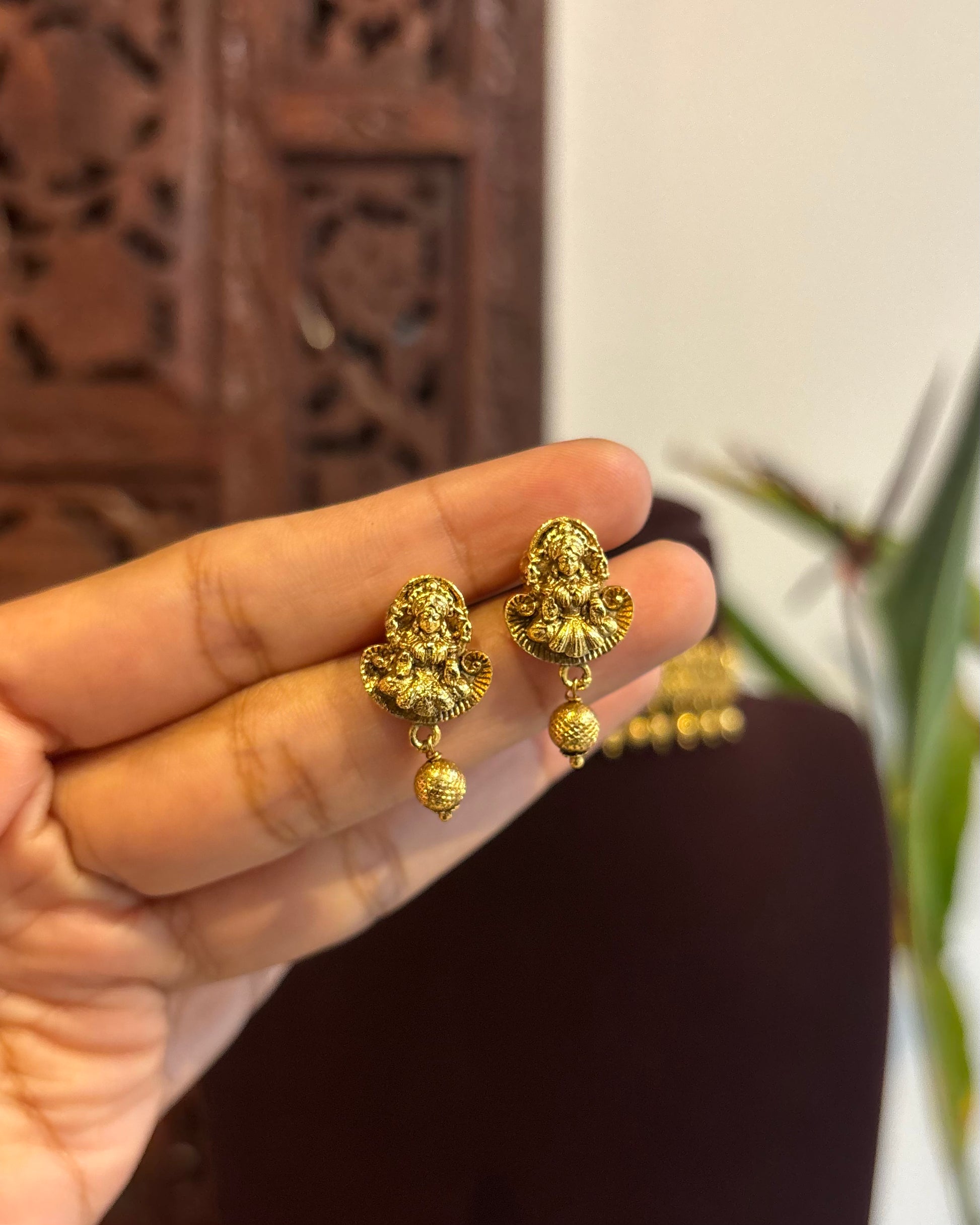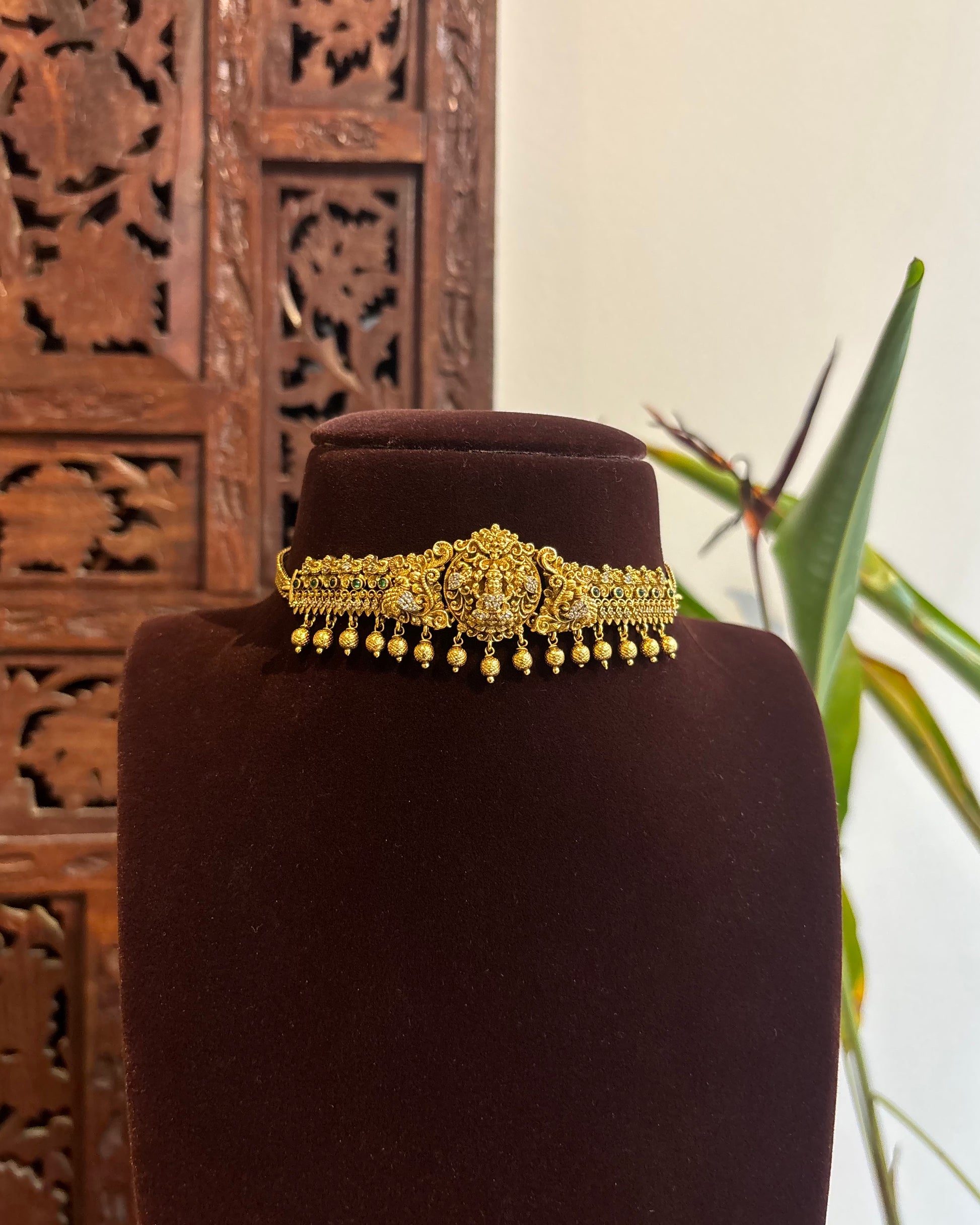 Embrace the timeless charm of temple jewellery without the heavy weight. This Minimal Lakshmi Choker features the auspicious motif of Goddess Lakshmi, intricately crafted to bring a touch of divine grace to your festive wardrobe.
