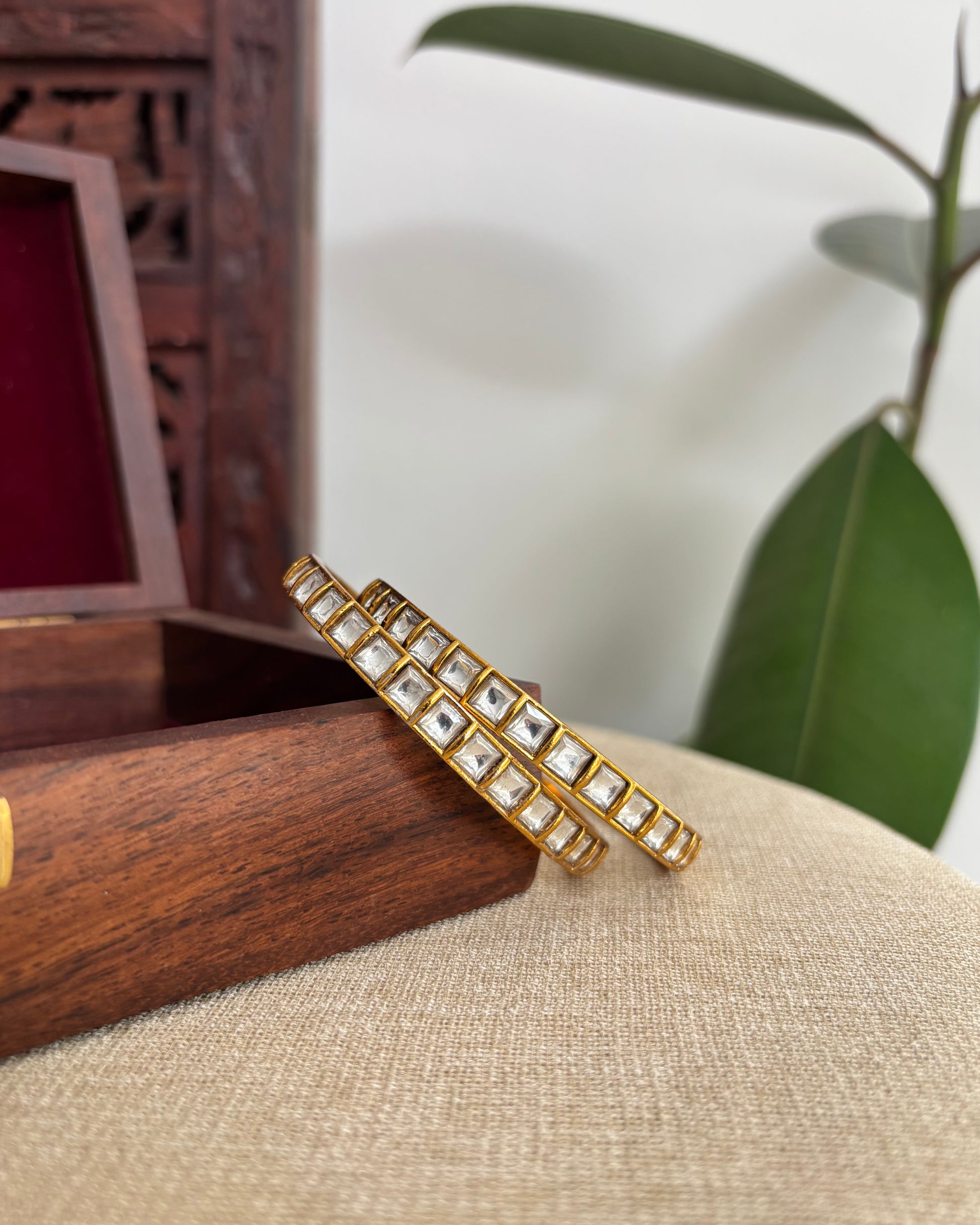 Simple, sophisticated, and timeless — these minimal Jadau Kundan Bangles feature a row of delicate square kundan stones, perfectly aligned for a clean and elegant look. The soft white color adds a graceful touch, making them perfect for both traditional and contemporary outfits. Light, comfortable, and effortlessly stylish!