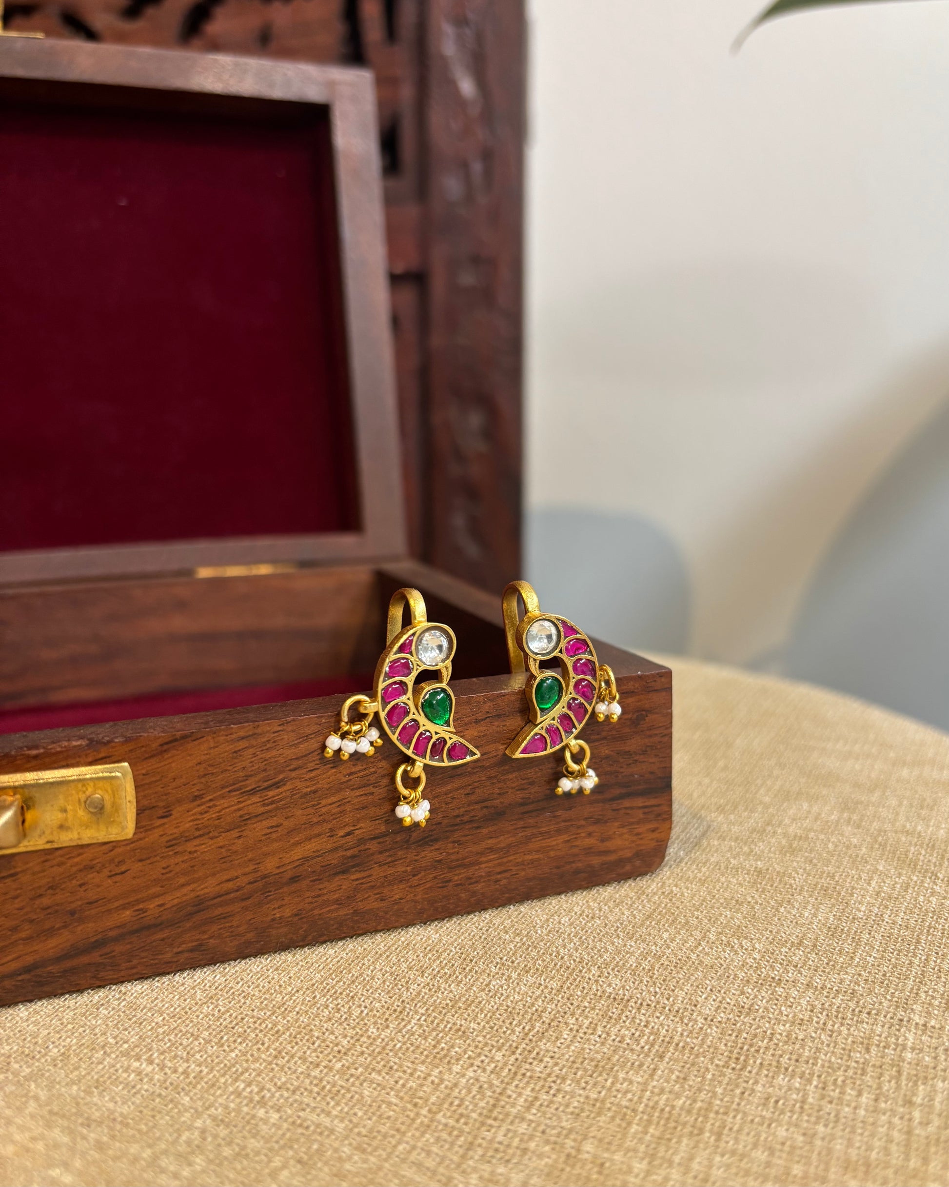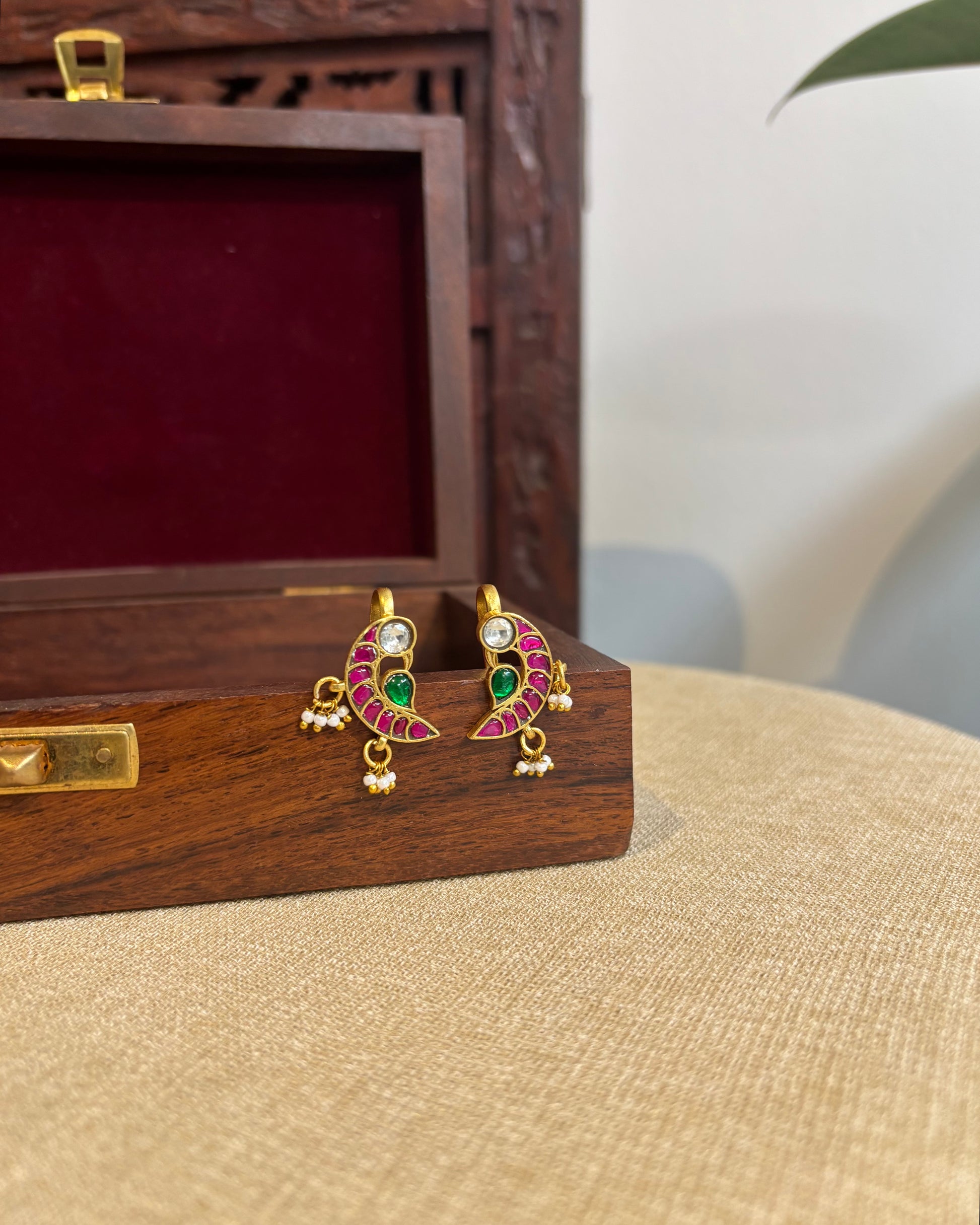 Elegant and timeless, this peacock bugadi is a beautiful blend of minimal design and traditional charm. Handcrafted with a classic kundan stone at the center, the floral motif is finished in a soft gold polish, making it a subtle yet graceful ear accessory.