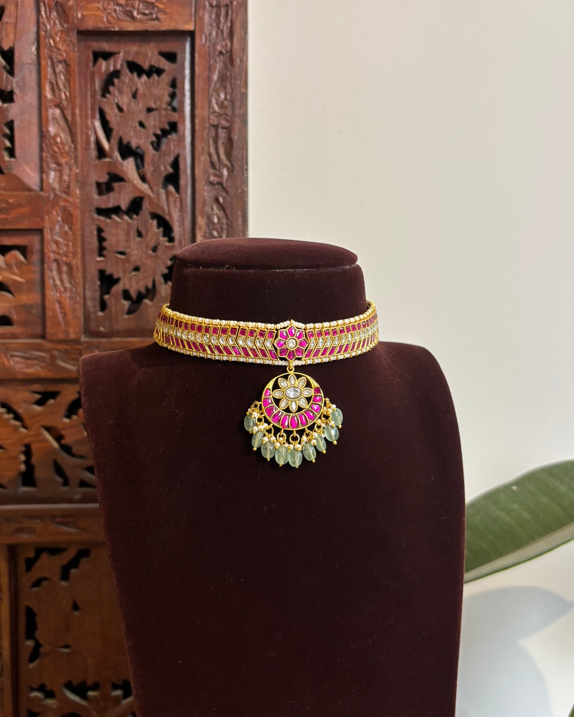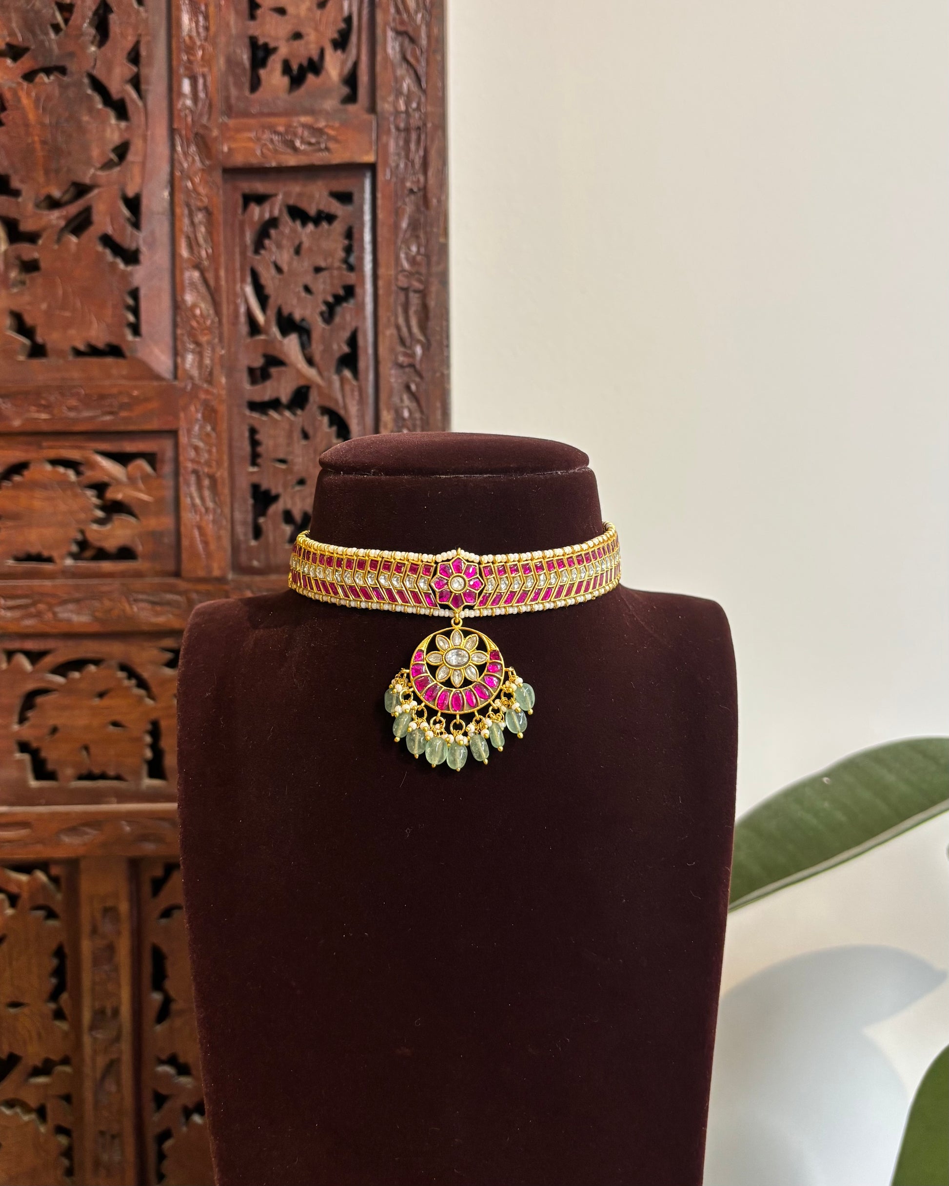 A piece you’ll fall in love with instantly. This intricate Kundan choker is crafted with precision, where every element is beautifully aligned and seamlessly joined together to create a refined, structured silhouette.