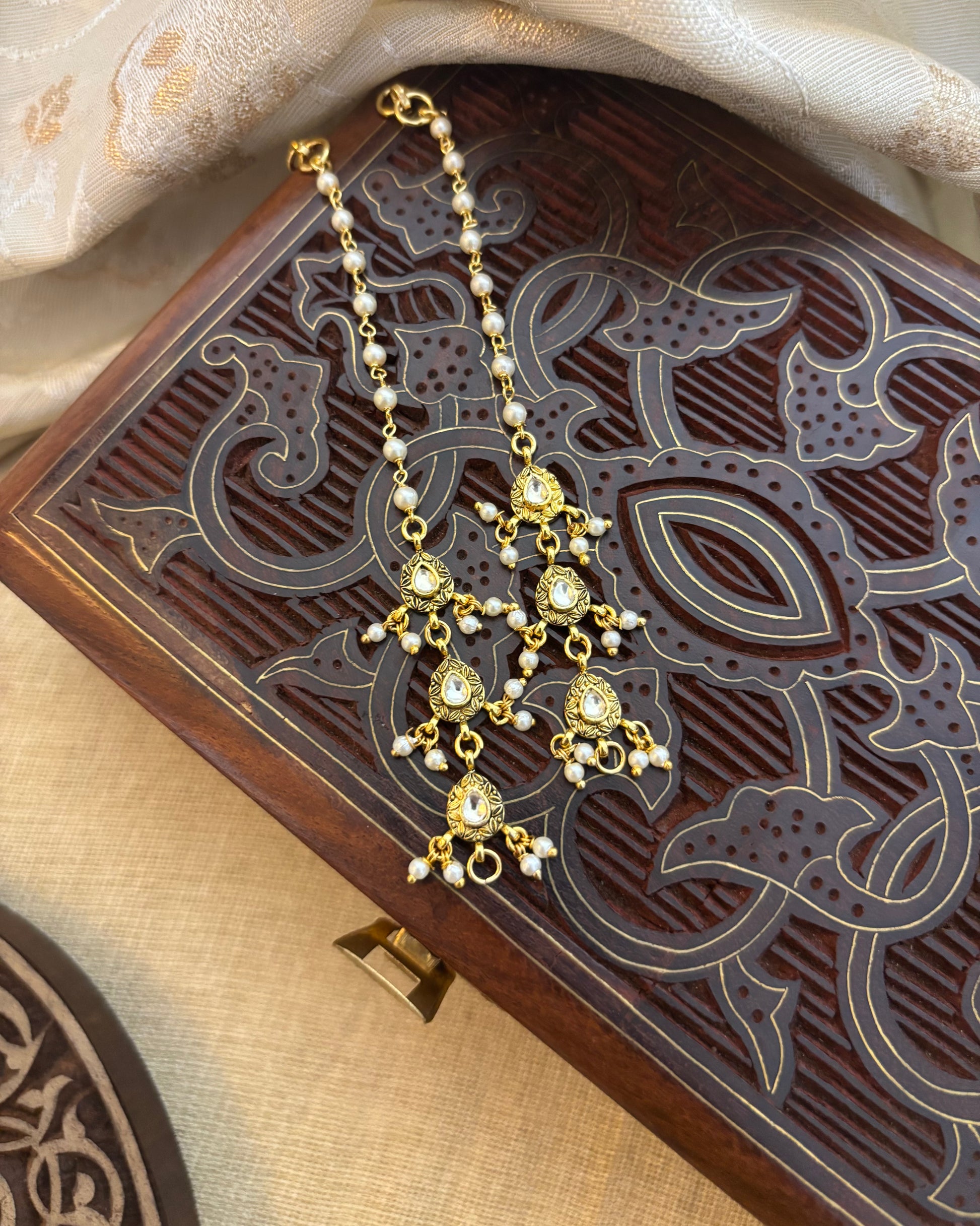 White Jadau Kundan Straight Maattal | Gold Plated Finish | EC081