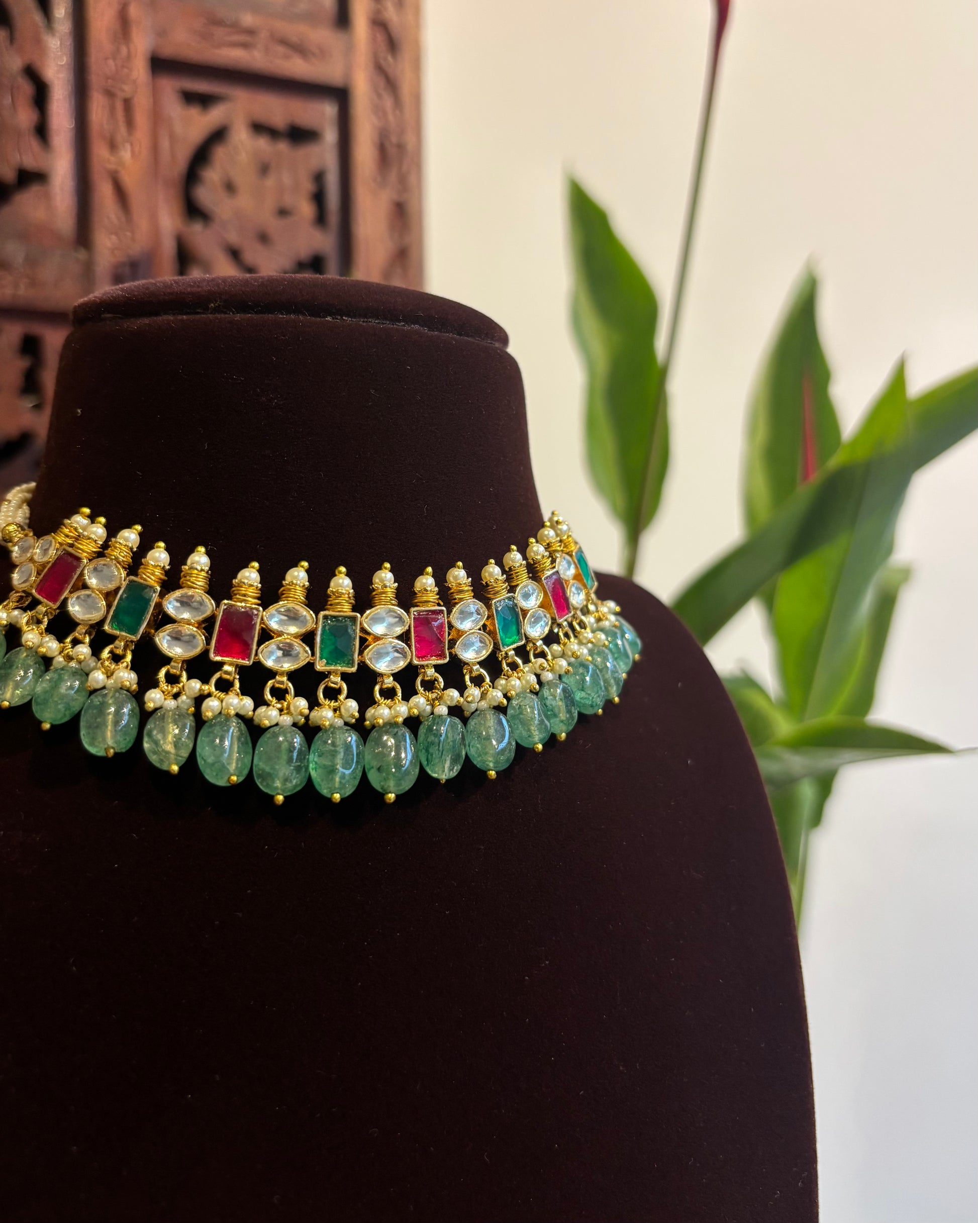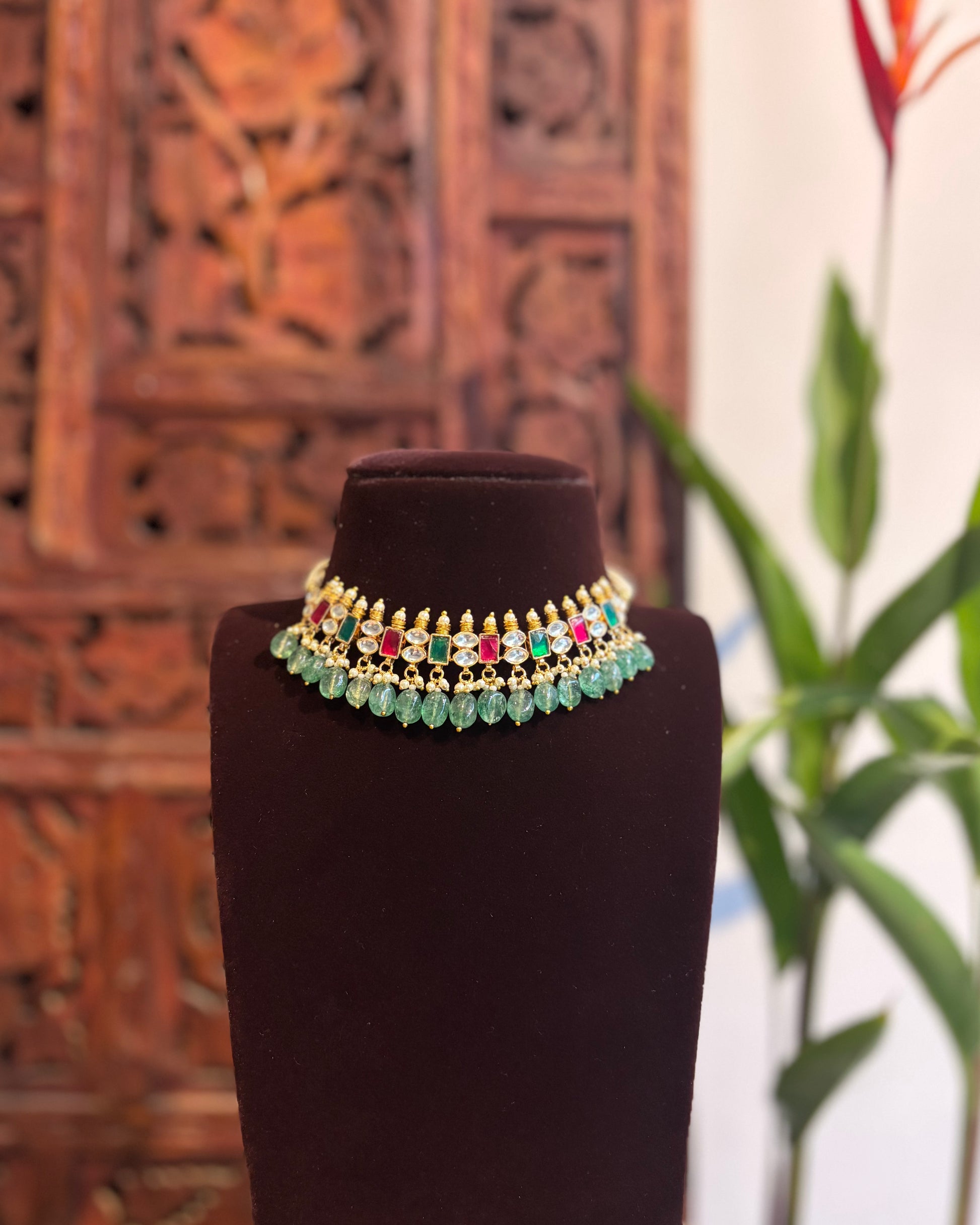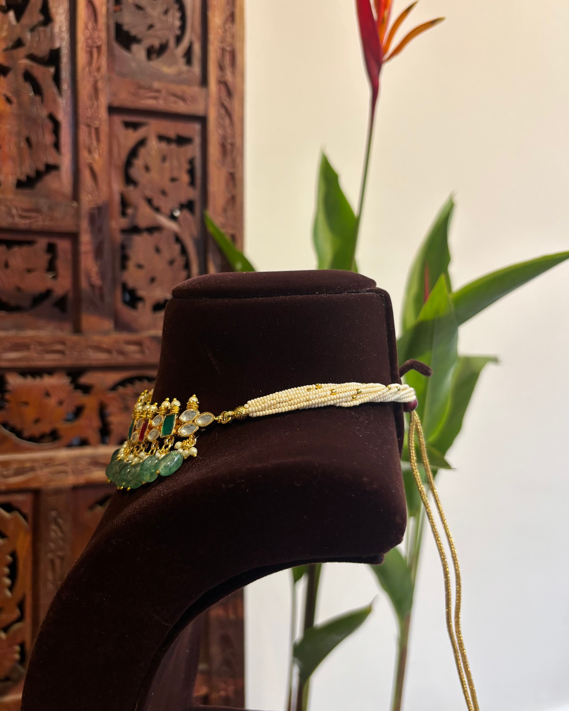 A graceful blend of bold and minimal, this multicolor choker set features delicately layered kundan stones, finished with elegant white pearls for a soft contrast.
