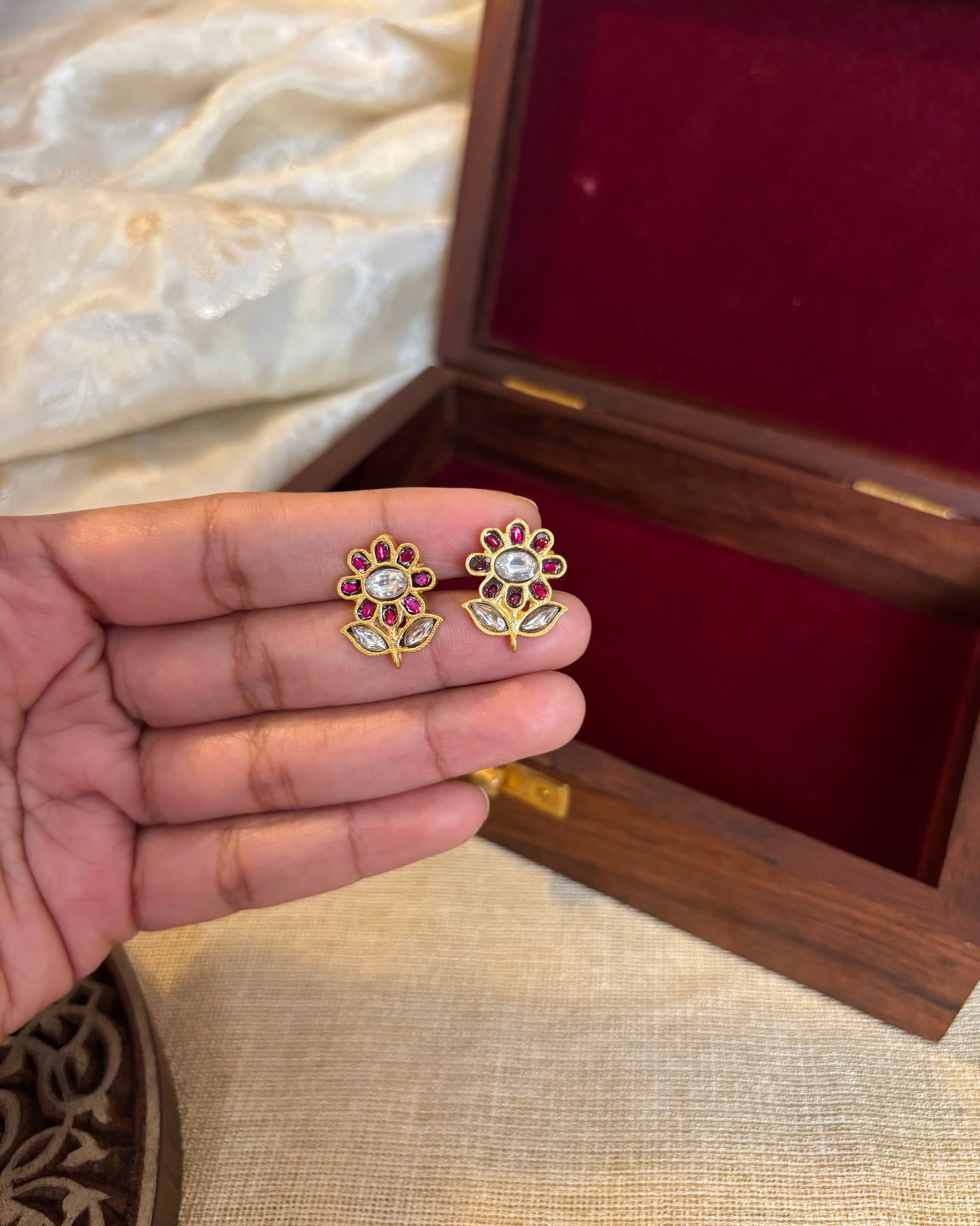 These SunFlower Studs are a delightful mix of simplicity and elegance. Designed in a charming parrot shape with kundan stones, they add just the right touch of sparkle without being overwhelming.