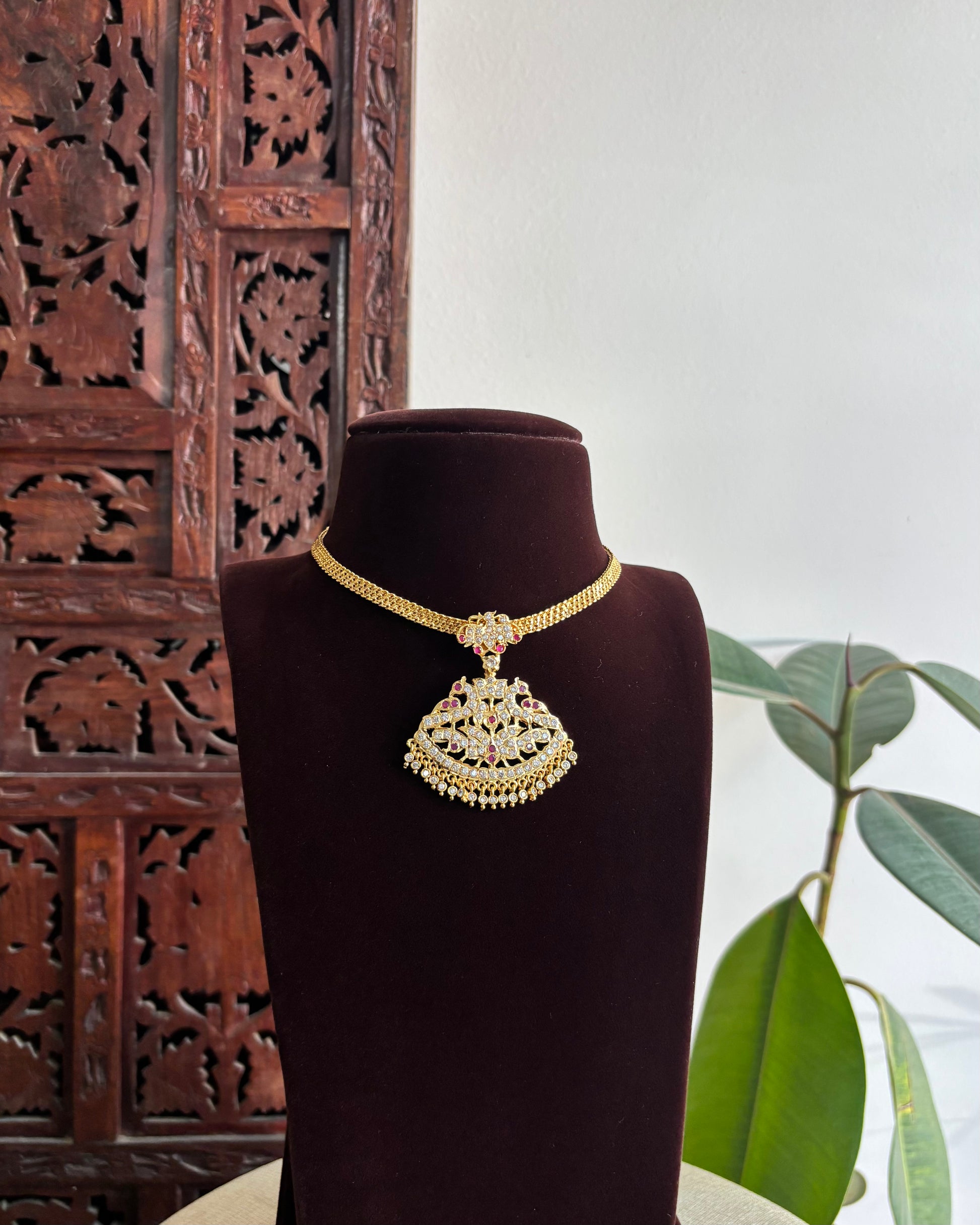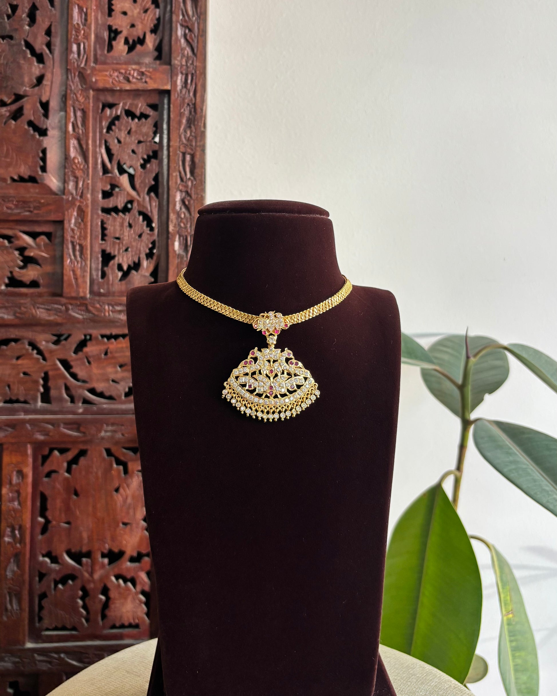 Peacock Motif Impon Pendant Attigai Necklace – Ruby & White | NC339