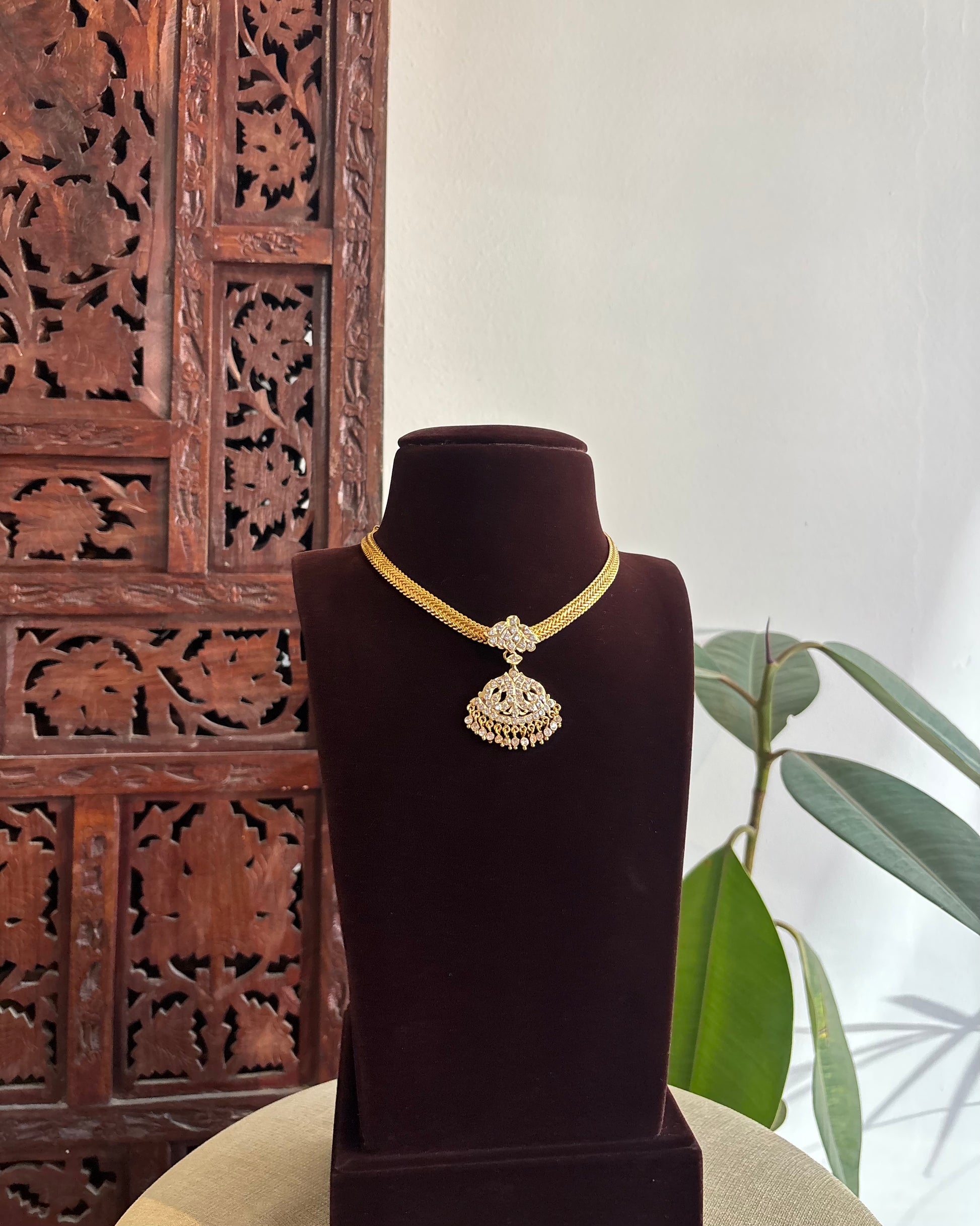 This exquisite attigai necklace features a striking peacock motif pendant suspended from a delicate, minimalist chain. Crafted in traditional impon with ruby and white stone accents, the design captures the elegance of vintage South Indian jewelry. The pendant commands attention while the refined chain ensures understated sophistication. This set embodies timeless craftsmanship and cultural heritage, perfect for festive occasions or everyday elegance.