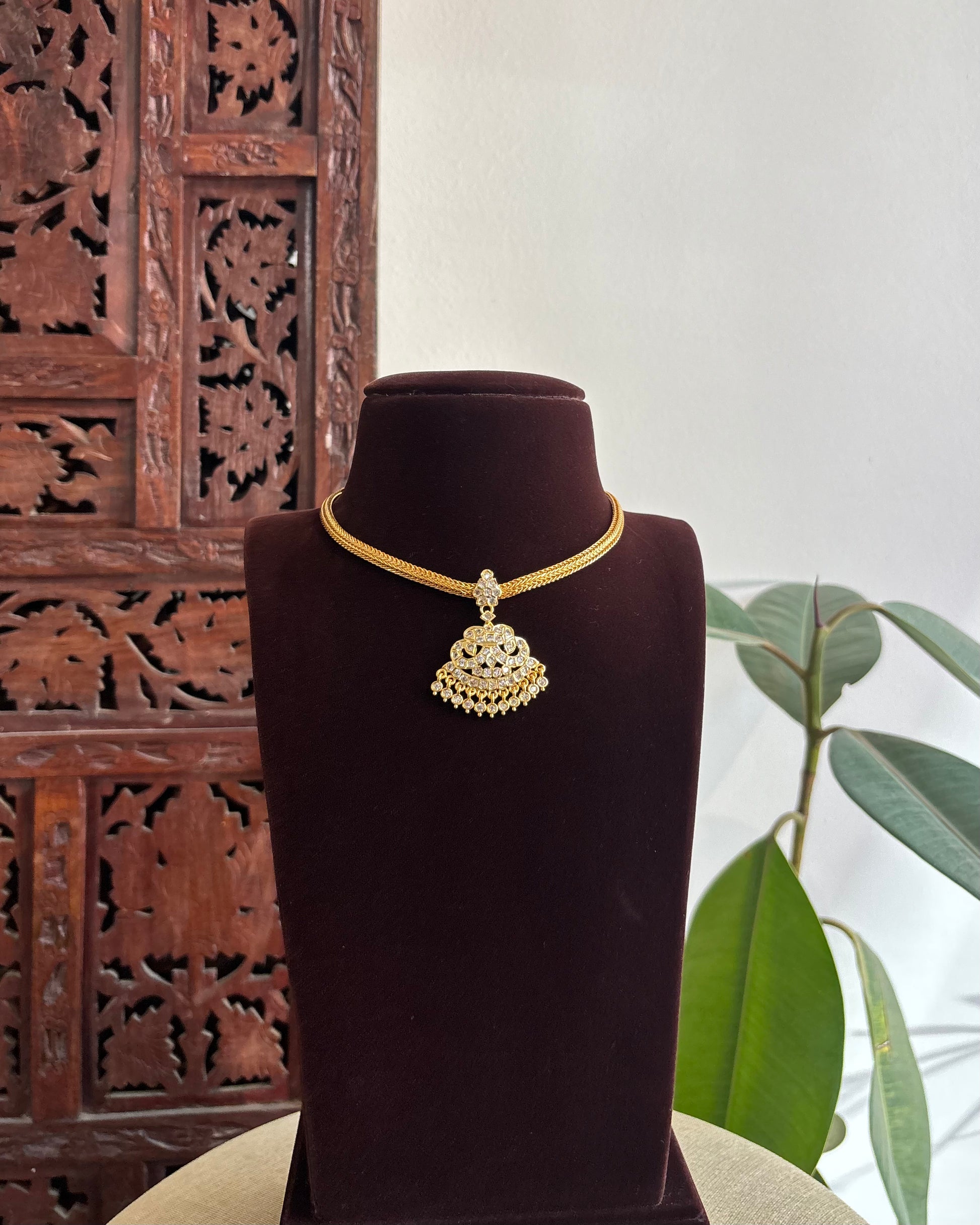 This exquisite attigai necklace features a striking peacock motif pendant suspended from a delicate, minimalist chain. Crafted in traditional impon with ruby and white stone accents, the design captures the elegance of vintage South Indian jewelry. The pendant commands attention while the refined chain ensures understated sophistication. This set embodies timeless craftsmanship and cultural heritage, perfect for festive occasions or everyday elegance.