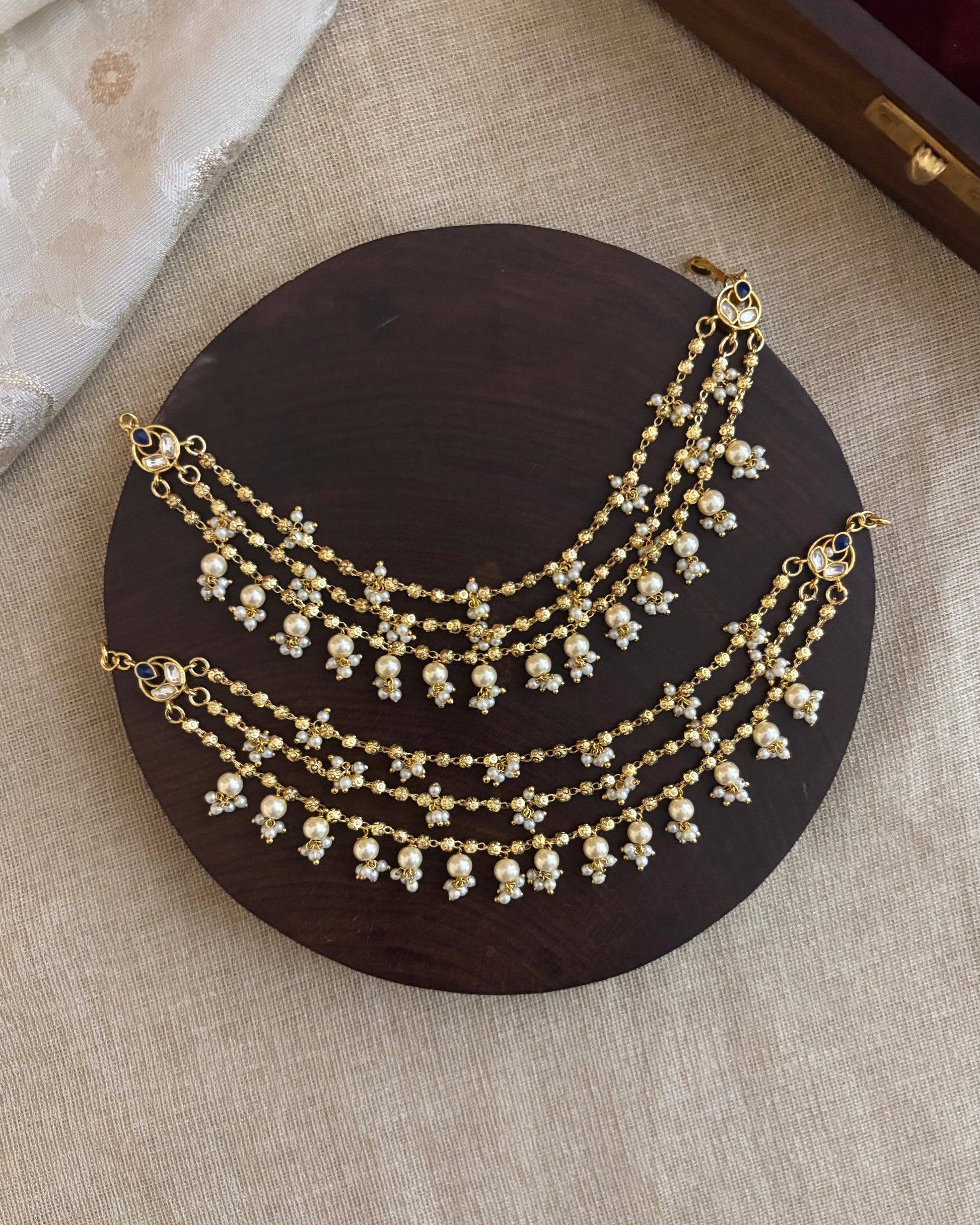 This ear chain features three strands of lustrous pearls, intricately linked to provide a cascading effect that enhances the beauty of any traditional or contemporary ensemble. The lightweight yet durable design ensures comfort while exuding elegance.