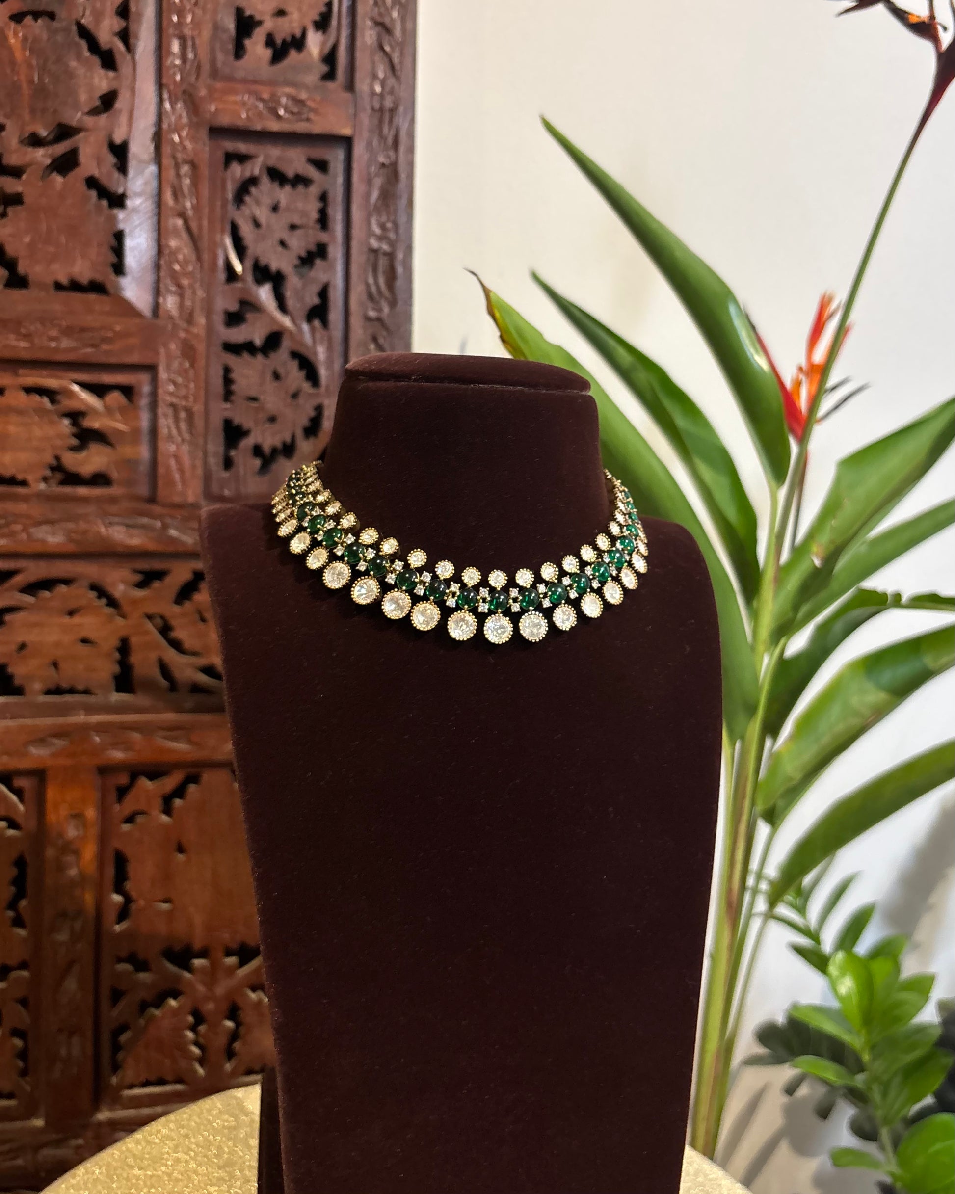 The Radiant Victorian Polki Necklace Set is a breathtaking blend of vintage charm and intricate craftsmanship. This exquisite necklace features two beautifully structured rows of uncut Polki stones, delicately framed with deep red accents, creating a regal and luxurious appeal. The design showcases a harmonious fusion of heritage and modern elegance, making it a perfect statement piece for any occasion.