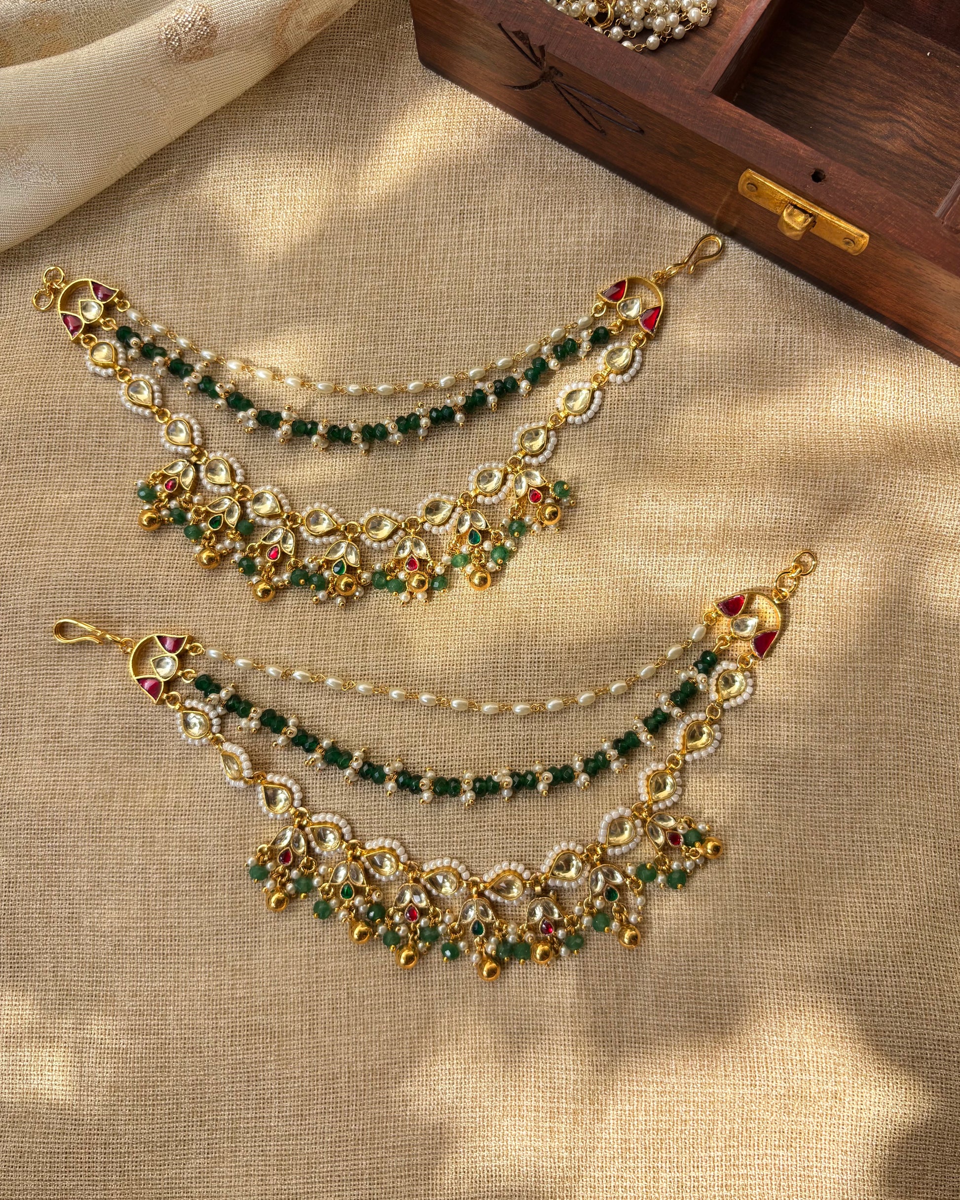 This exquisite three-layered floral ear chain is a testament to skilled craftsmanship, where every detail is meticulously handcrafted to ensure perfection in design and elegance in wear. Made from brass and gold-plated for a rich, heirloom-inspired finish, each element is carefully curated with precision, from the delicate Kundan stones to the hand-strung pearls and green beads that add a touch of regal charm.