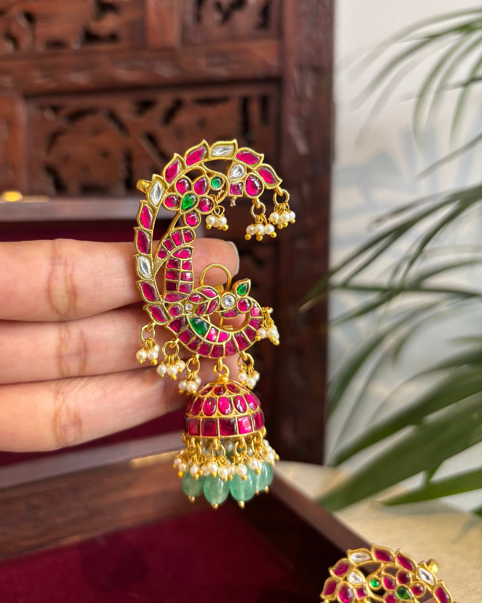 A masterpiece of artistry, these Peacock Ear Cuff Jhumkas beautifully capture the elegance of the peacock and its feathers through intricate kundan work. The detailed craftsmanship brings out every curve and motif, making the design both regal and unique.