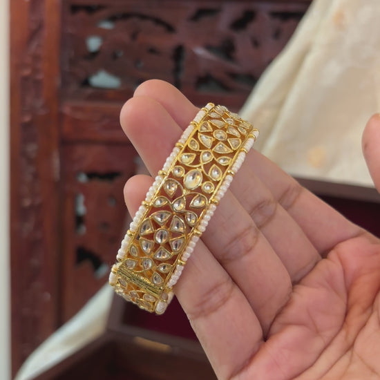 Simple, sophisticated, and timeless — these minimal Jadau Kundan Bangles feature a row of delicate floral kundan stones, perfectly aligned for a clean and elegant look. The subtle white color adds a graceful touch, making them perfect for both traditional and contemporary outfits. Light, comfortable, and effortlessly stylish!