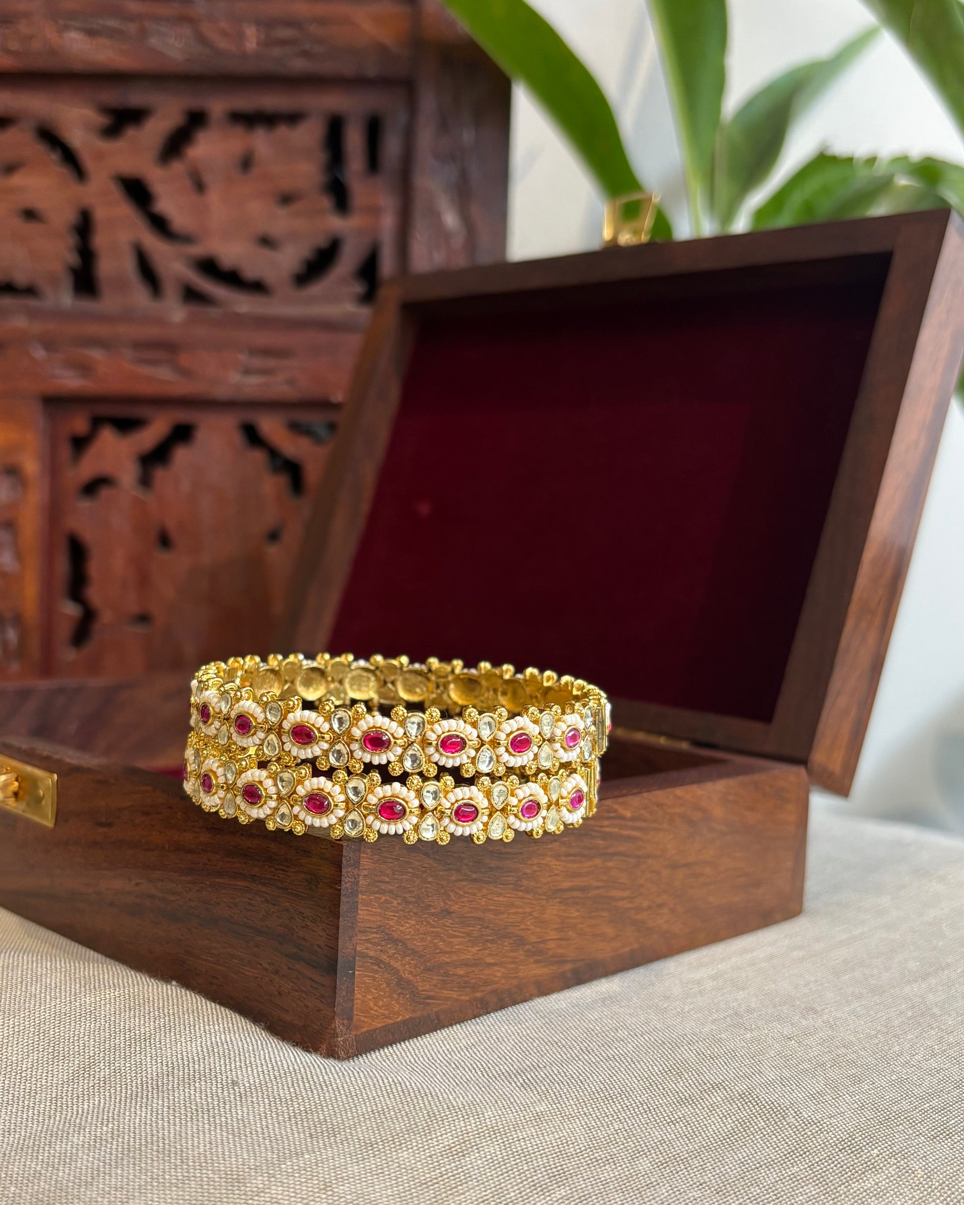 Simple, sophisticated, and timeless — these minimal Jadau Kundan Bangles feature a row of delicate kundan stones, perfectly aligned for a clean and elegant look. The vibrant ruby color adds a graceful touch, making them perfect for both traditional and contemporary outfits. Light, comfortable, and effortlessly stylish!