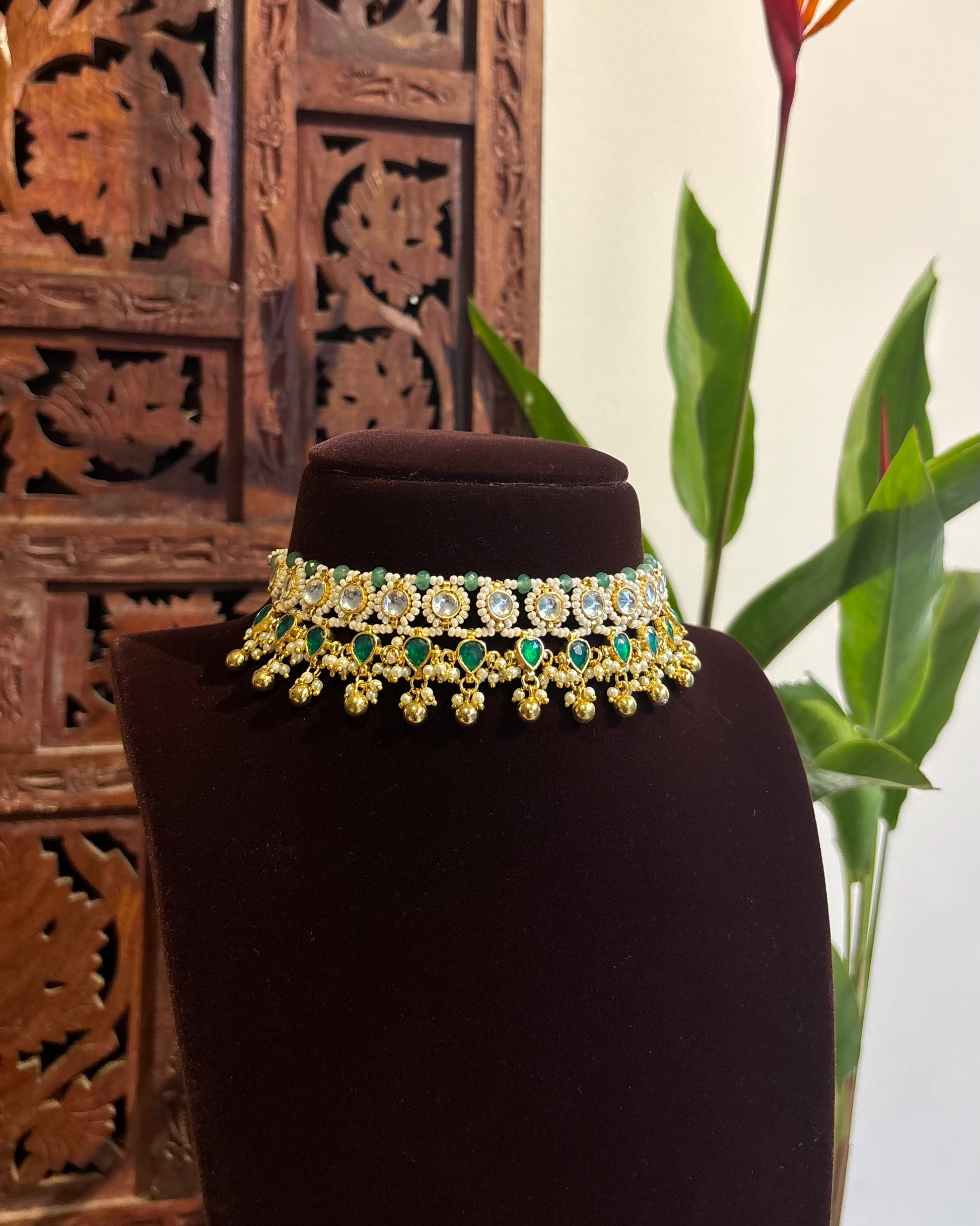 Green White Kundan Choker Set with Earrings – Minimal Statement | NC166