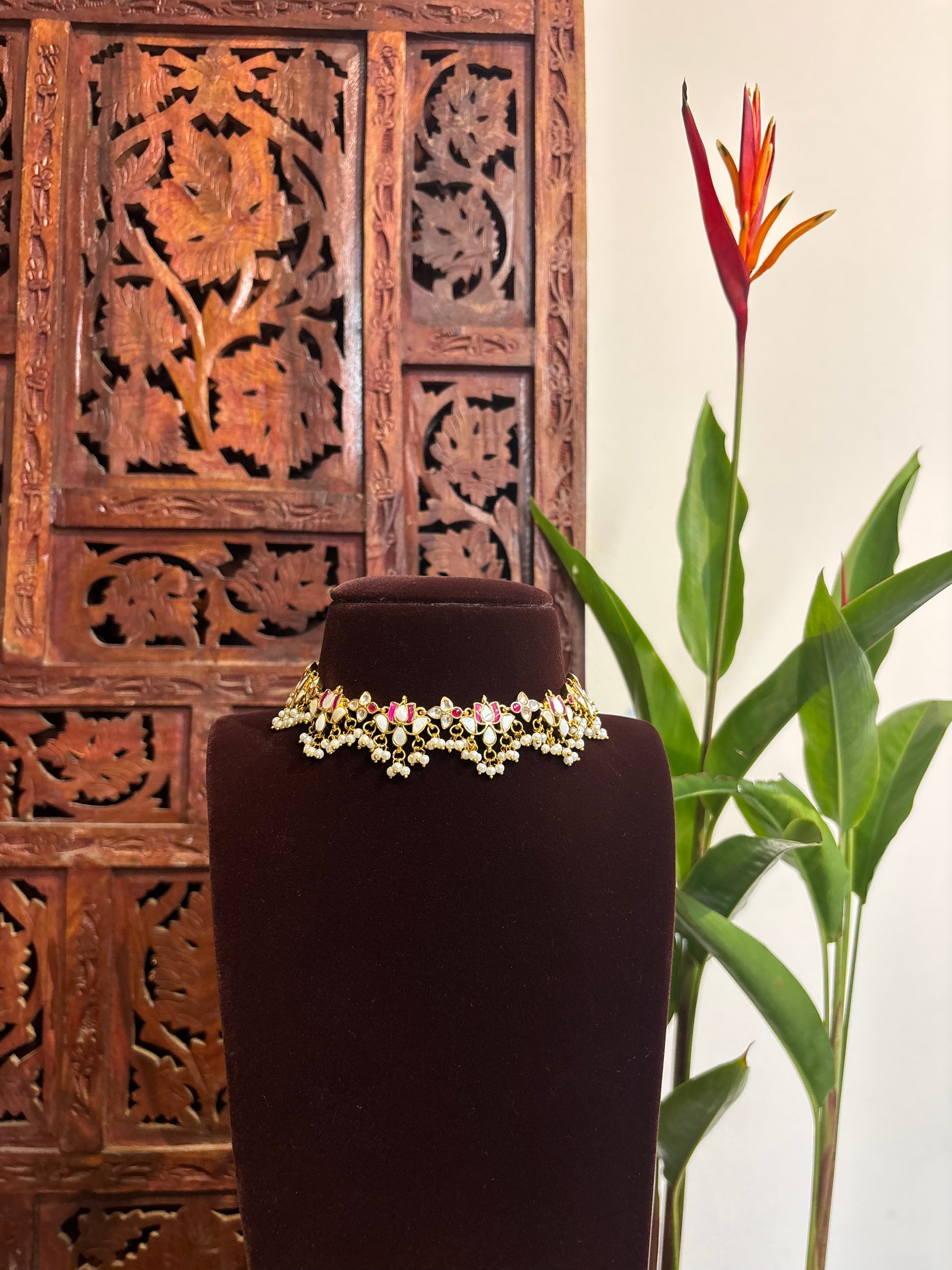 Pink White Lotus Kundan Choker Set with Earrings – Minimal Statement | NC164