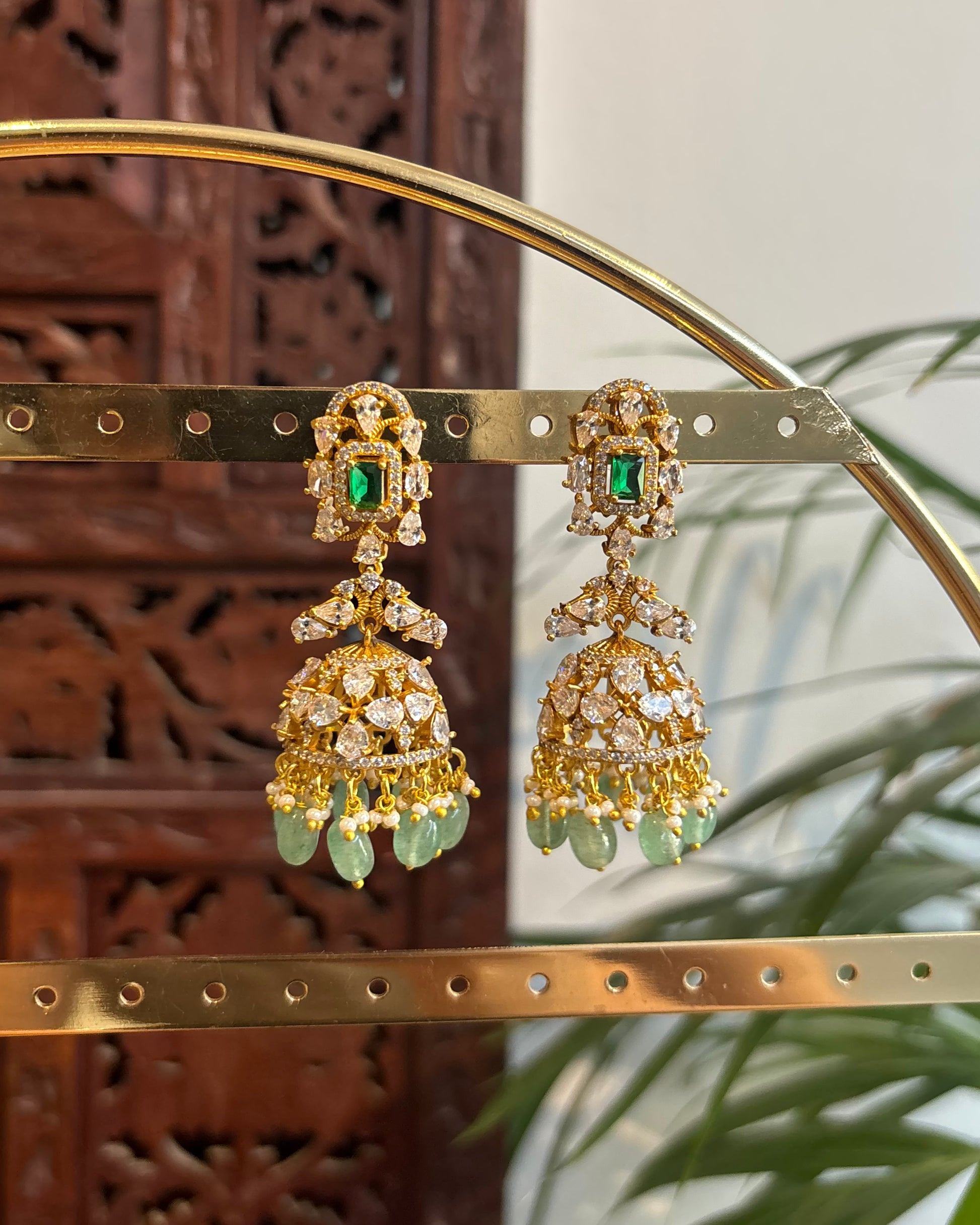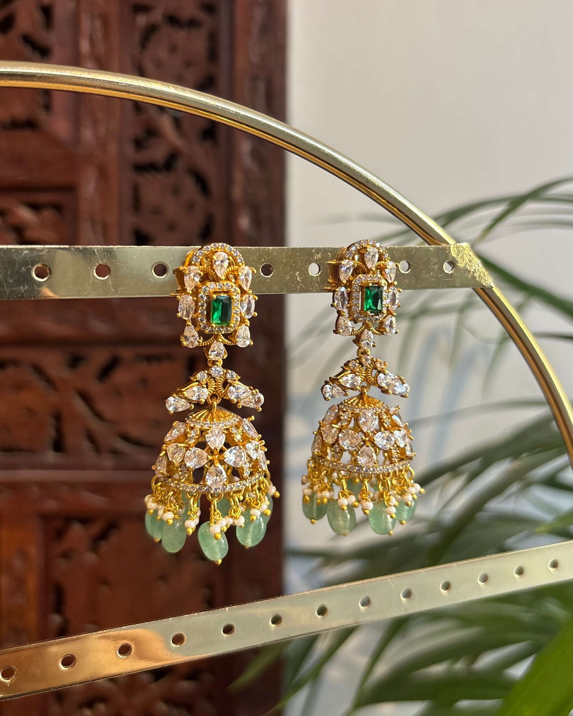 Green & White Moissanite Floral Long Statement Jhumkas | ER247