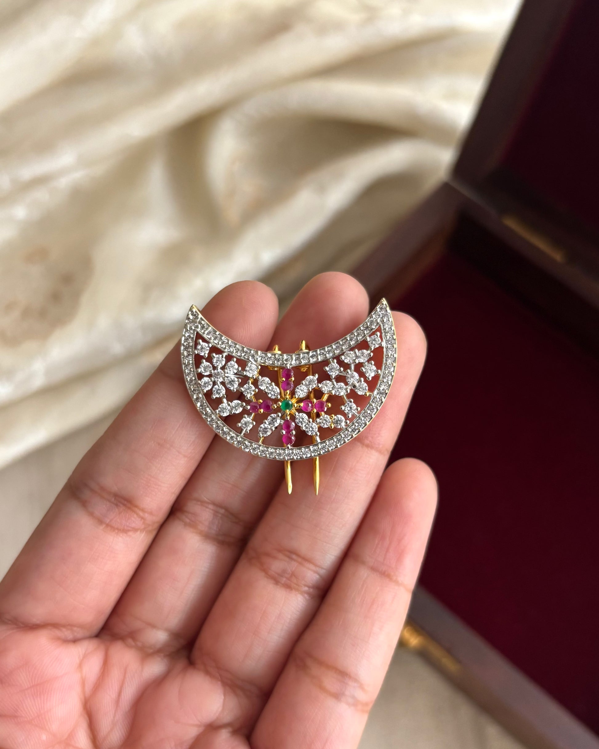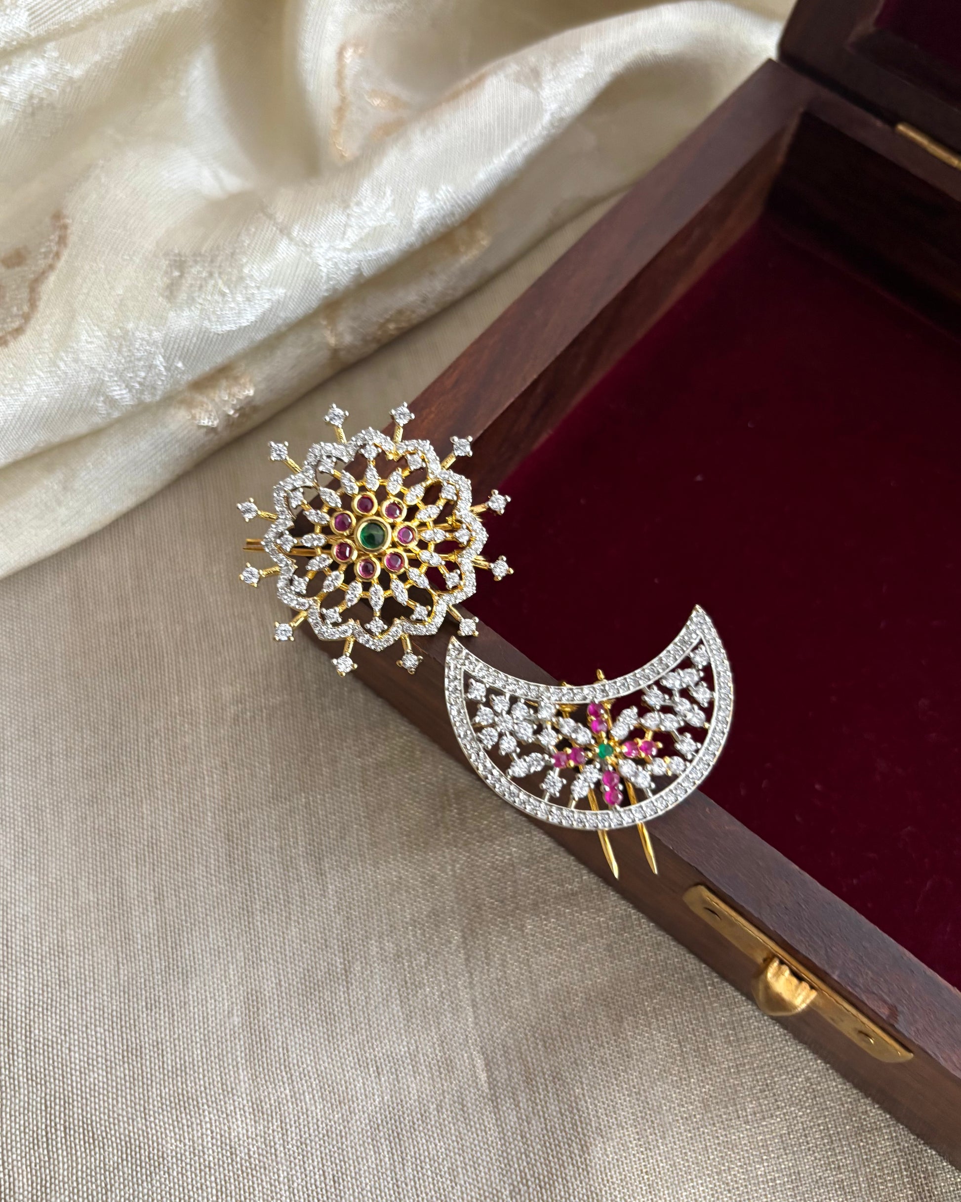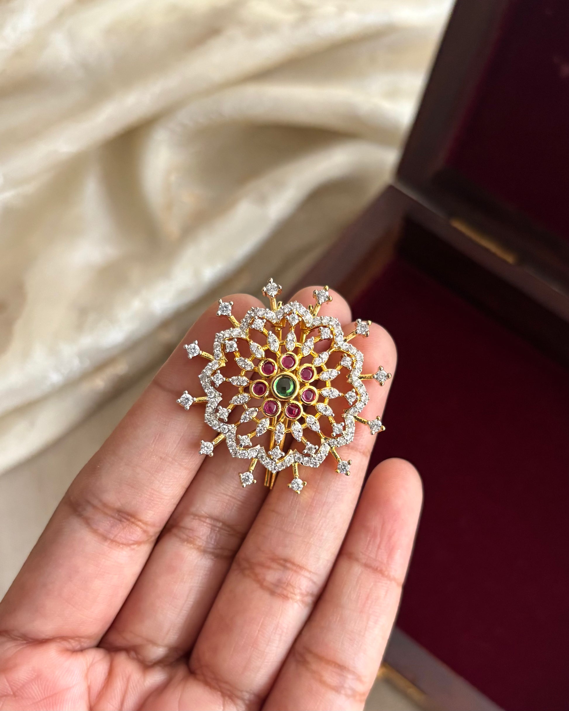 Inspired by celestial beauty and rooted in South Indian tradition, this Sun & Moon Kemp Hair Accessory set is a timeless symbol of cultural elegance. Adorned with classic kemp stones in rich ruby, white and green hues, each piece is meticulously crafted for a radiant finish.