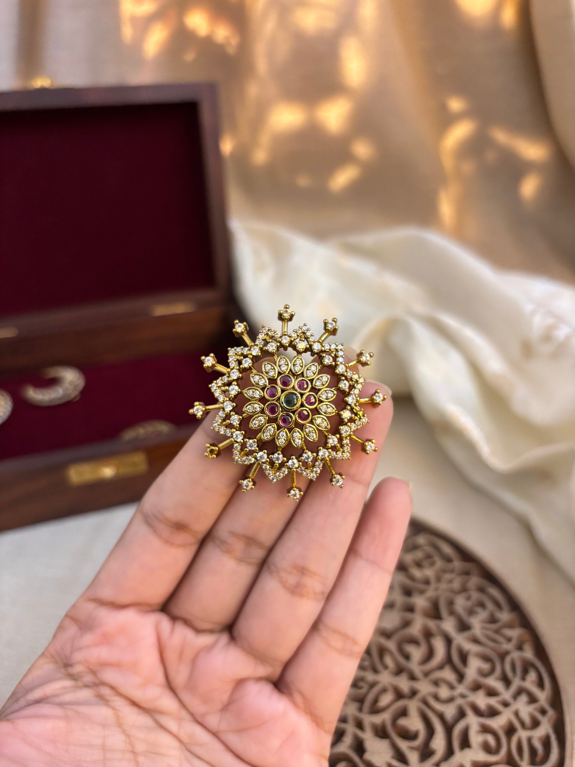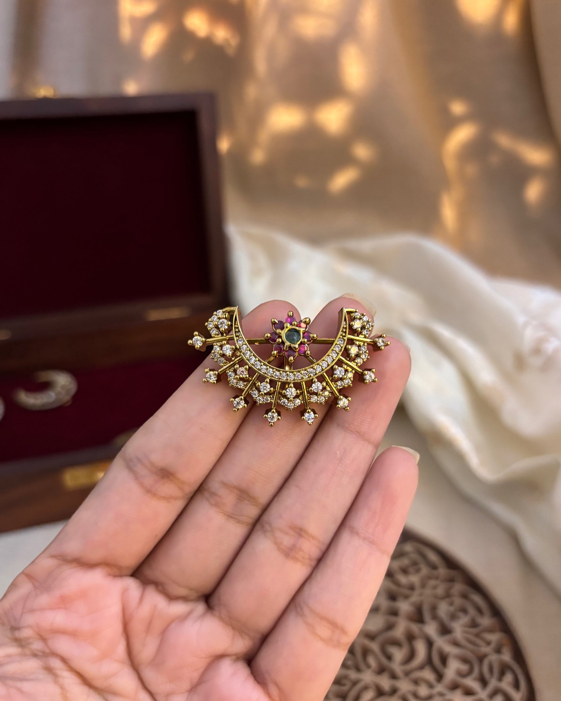 Inspired by celestial beauty and rooted in South Indian tradition, this Sun & Moon Kemp Hair Accessory set is a timeless symbol of cultural elegance. Adorned with classic kemp stones in rich ruby, white and green hues, each piece is meticulously crafted for a radiant finish.